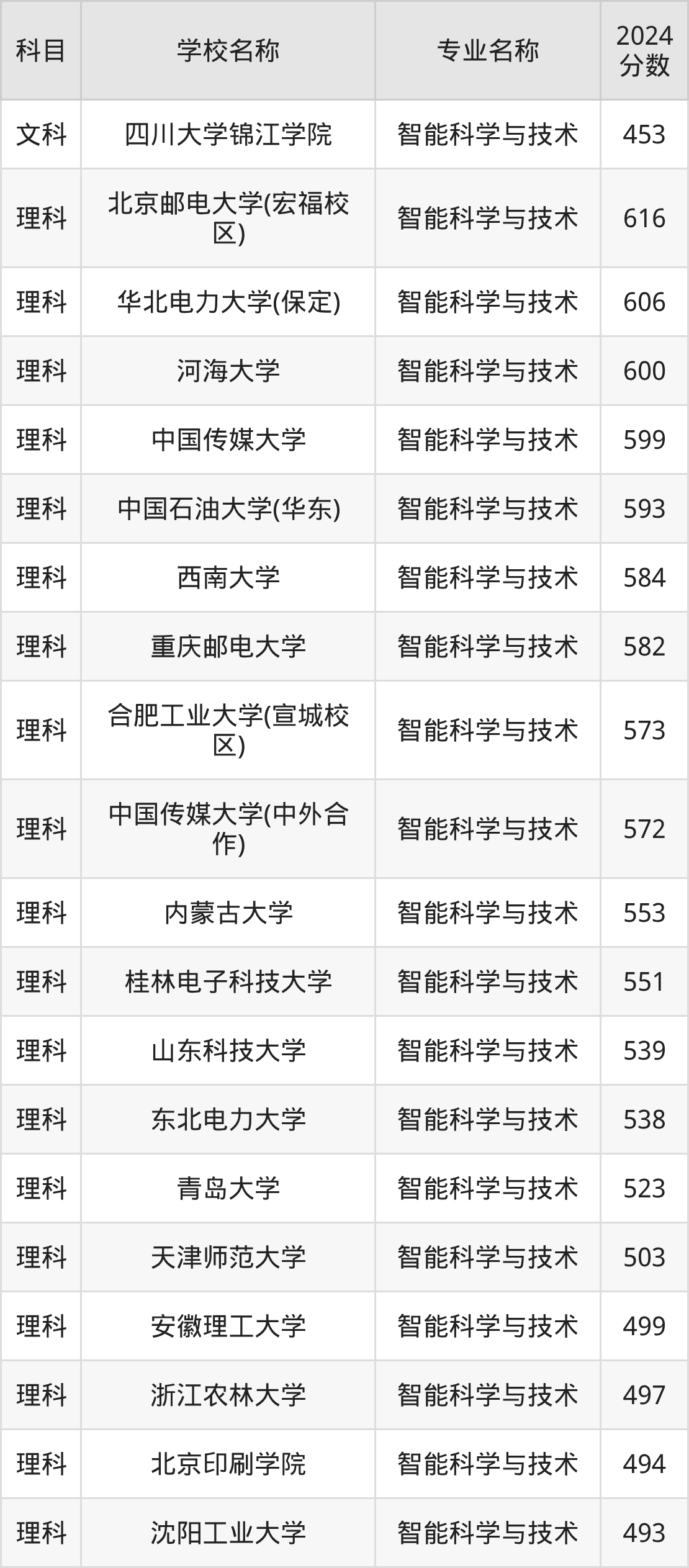 通过上文大家可以知晓,在陕西省内招智能科学与技术专业的院校数量较少,所以下文将为2026届高考生继续展示:省外大学的智能科学与技术专业2024年在陕西高考的录取情况,包含四川大学锦江学院、北京邮电大学(宏福校区)、华北电力大学(保定)、河海大学、中国传媒大学。