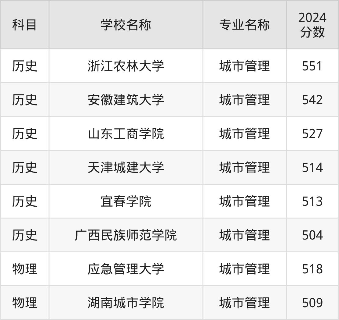 通过上文大家可以知晓,在江苏省内招城市管理专业的院校数量较少,所以下文将为2026届高考生继续展示:省外大学的城市管理专业2024年在江苏高考的录取情况,包含浙江农林大学、安徽建筑大学、山东工商学院、天津城建大学、宜春学院。