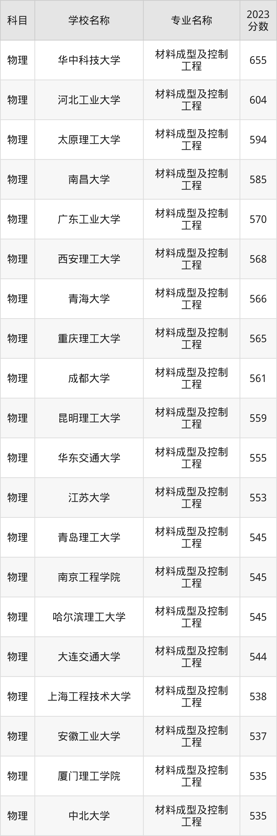 通过上文大家可以知晓,在湖南省内招材料成型及控制工程专业的院校数量较少,所以下文将为2025届高考生继续展示:省外大学的材料成型及控制工程专业2023年在湖南高考的录取情况,包含华中科技大学、河北工业大学、太原理工大学、南昌大学、广东工业大学。