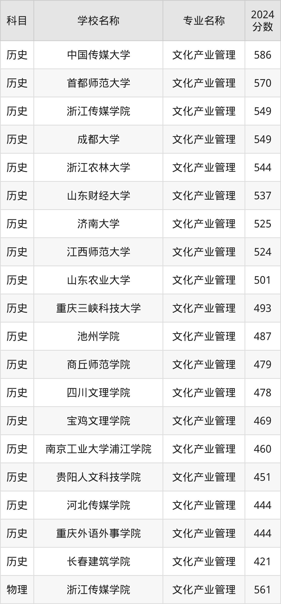 通过上文大家可以知晓,在福建省内招文化产业管理专业的院校数量较少,所以下文将为2026届高考生继续展示:省外大学的文化产业管理专业2024年在福建高考的录取情况,包含中国传媒大学、首都师范大学、浙江传媒学院、成都大学、浙江农林大学。