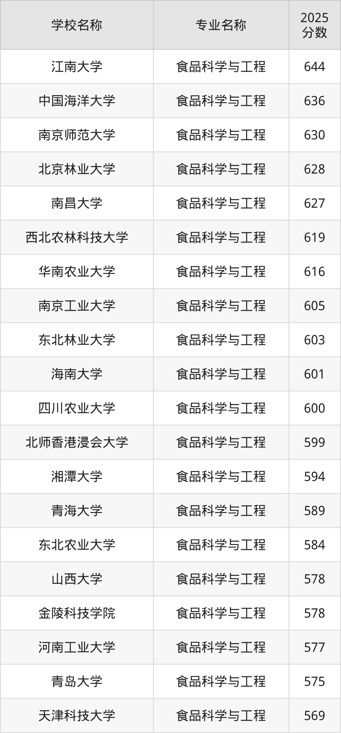 通过上文大家可以知晓,在浙江省内招食品科学与工程专业的院校数量较少,所以下文将为2026届高考生继续展示:省外大学的食品科学与工程专业2025年在浙江高考的录取情况,包含江南大学、中国海洋大学、南京师范大学、北京林业大学、南昌大学。