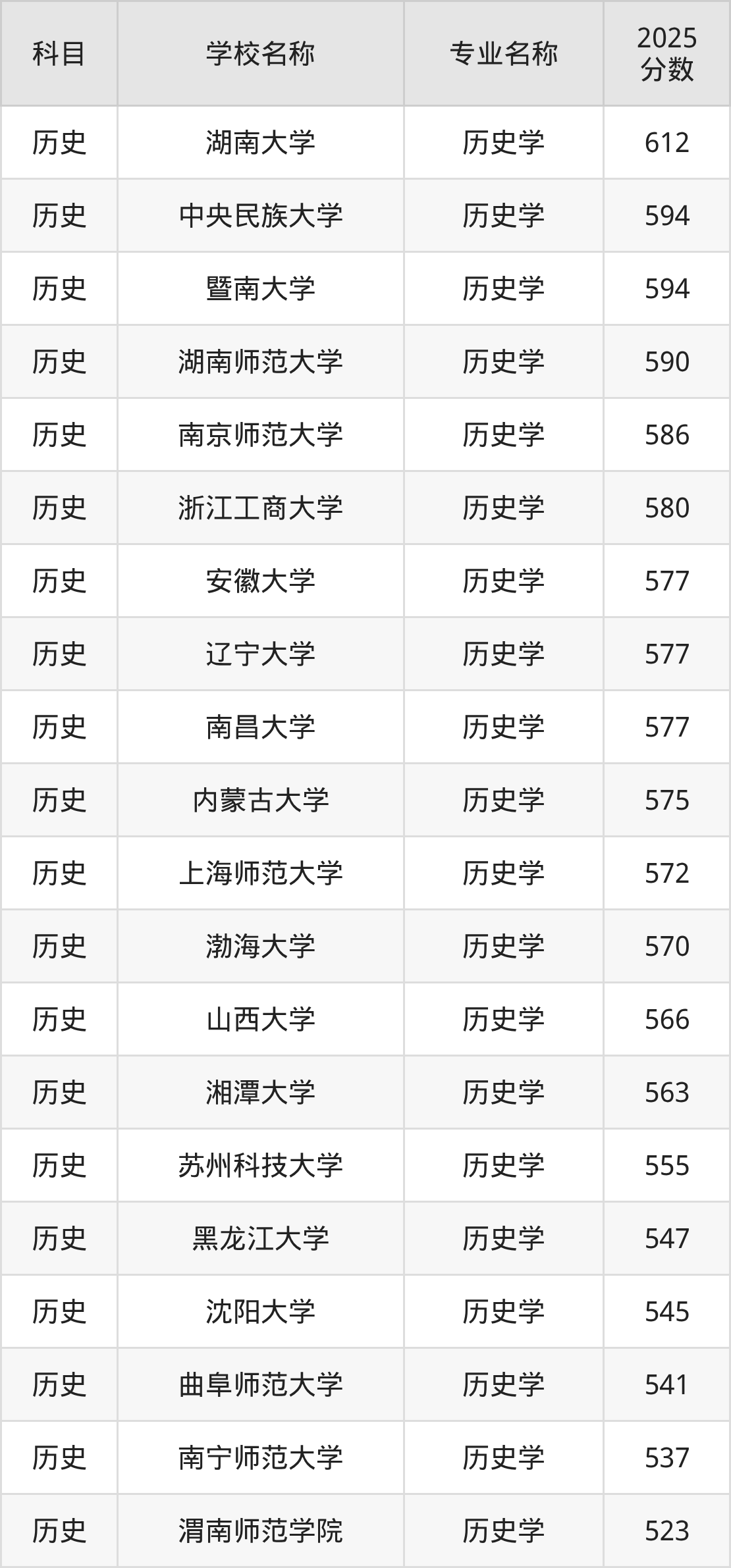 | 东北师范大学 | 历史学(师范类) | 600 |