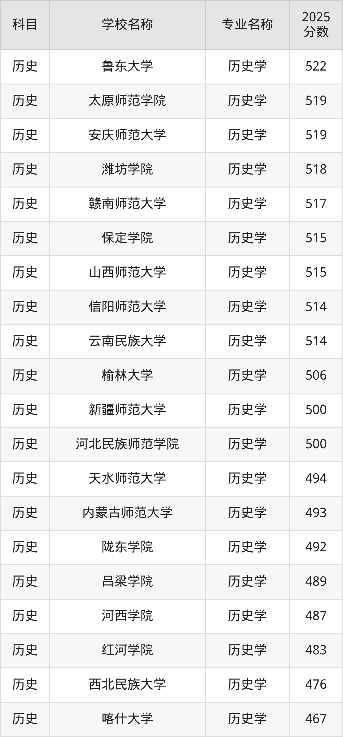| 通化师范学院 | 历史学(师范类) | 491 |