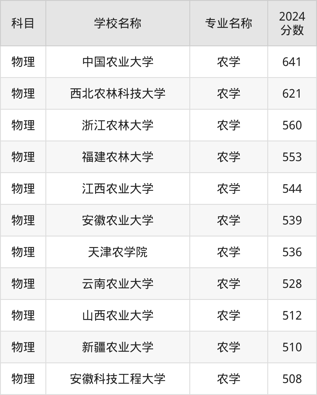 通过上文大家可以知晓,在江苏省内招农学专业的院校数量较少,所以下文将为2026届高考生继续展示:省外大学的农学专业2024年在江苏高考的录取情况,包含中国农业大学、西北农林科技大学、浙江农林大学、福建农林大学、江西农业大学。