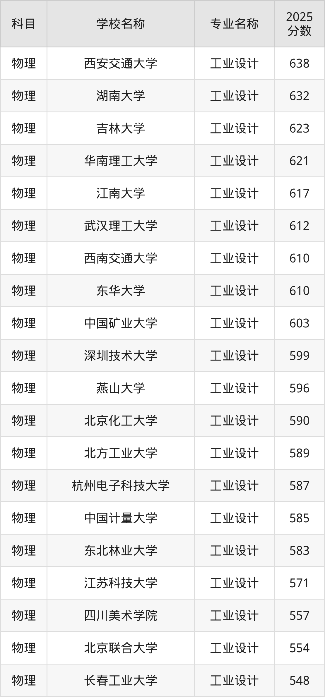 通过上文大家可以知晓,在辽宁省内招工业设计专业的院校数量较少,所以下文将为2026届高考生继续展示:省外大学的工业设计专业2025年在辽宁高考的录取情况,包含西安交通大学、湖南大学、吉林大学、华南理工大学、江南大学。