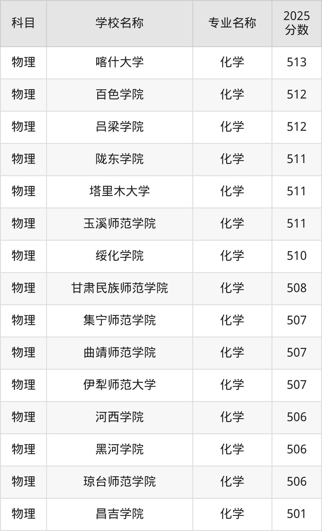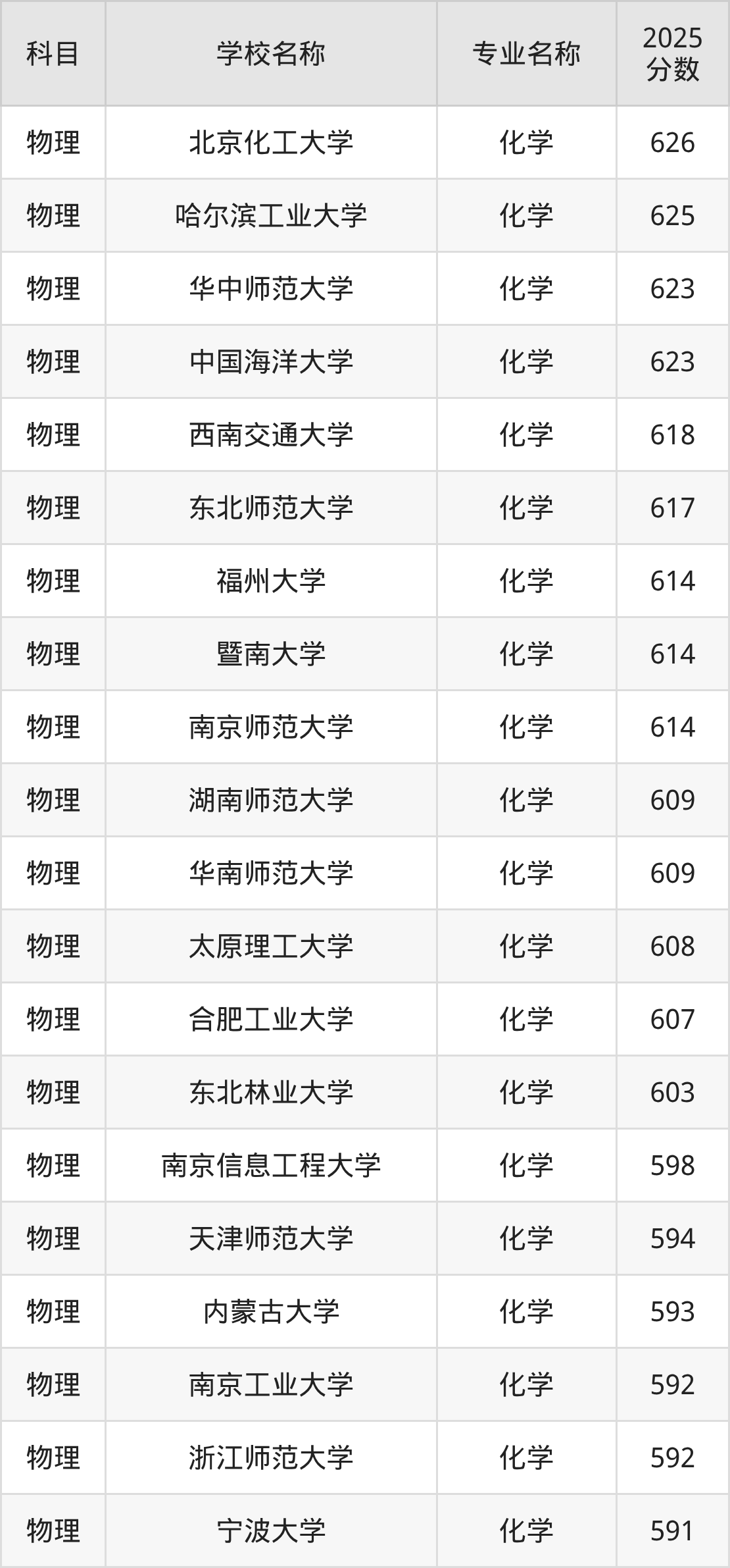 通过上文大家可以知晓,在河北省内招化学专业的院校数量较少,所以下文将为2026届高考生继续展示:省外大学的化学专业2025年在河北高考的录取情况,包含北京化工大学、哈尔滨工业大学、华中师范大学、中国海洋大学、西南交通大学。