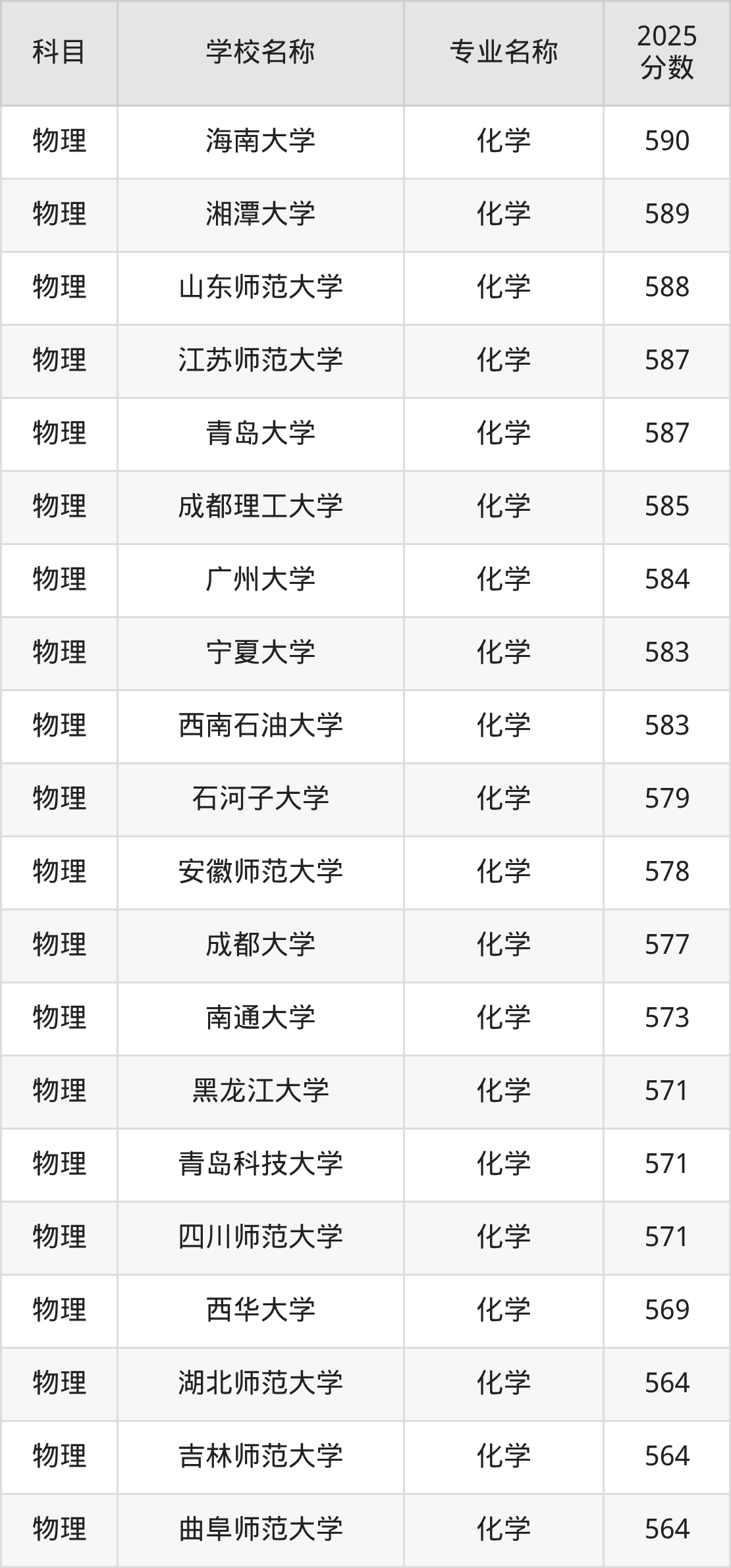 在直接以“化学”的名称招生的河北省大学中,河北师范大学(地方专项计划)的分数线最高、排名第一名,在物理组的最低分是565分,全省排名前61528位的高考生才有较大机会被录取。