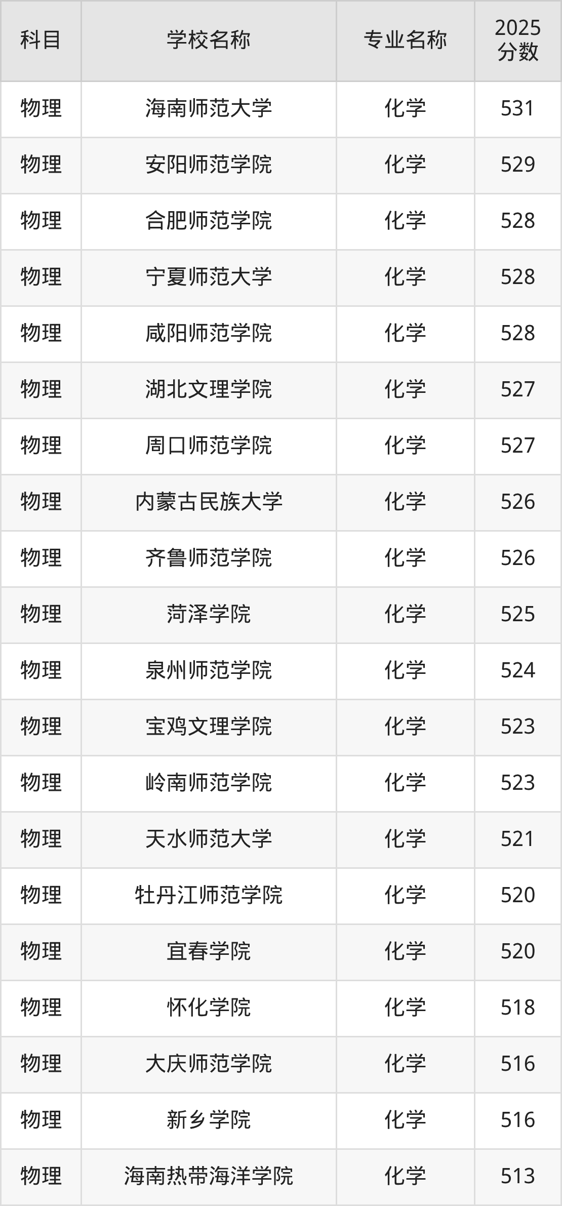 | 河北民族师范学院 | 化学(师范类) | 518 |