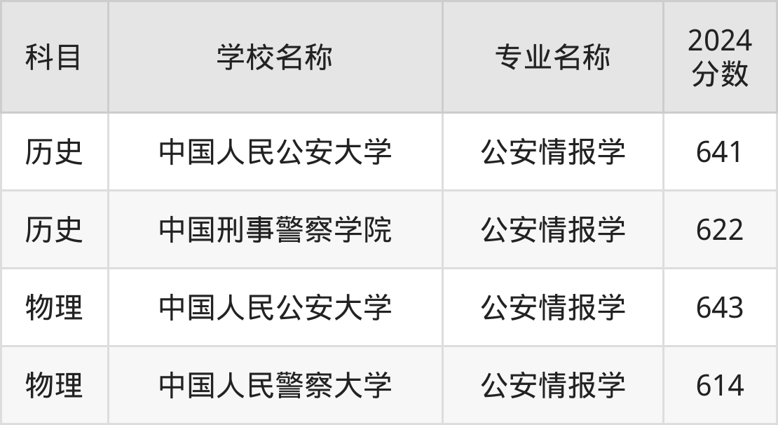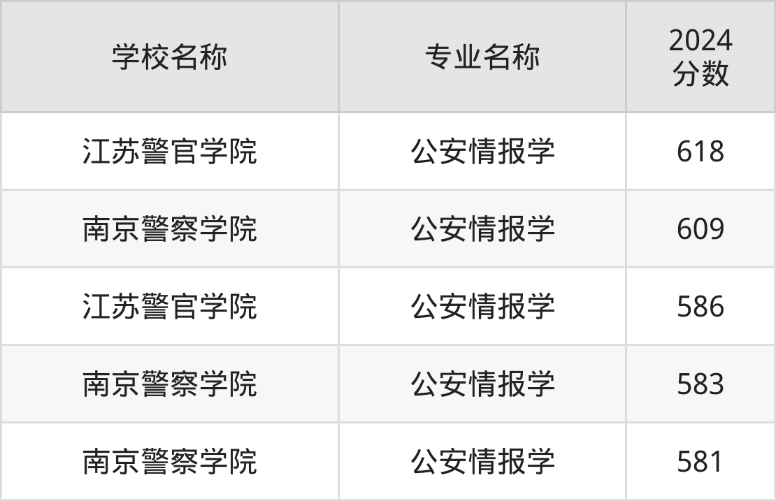 通过上文大家可以知晓,在江苏省内招公安情报学专业的院校数量较少,所以下文将为2025届高考生继续展示:省外大学的公安情报学专业2024年在江苏高考的录取情况,包含中国人民公安大学、中国刑事警察学院、中国人民警察大学。