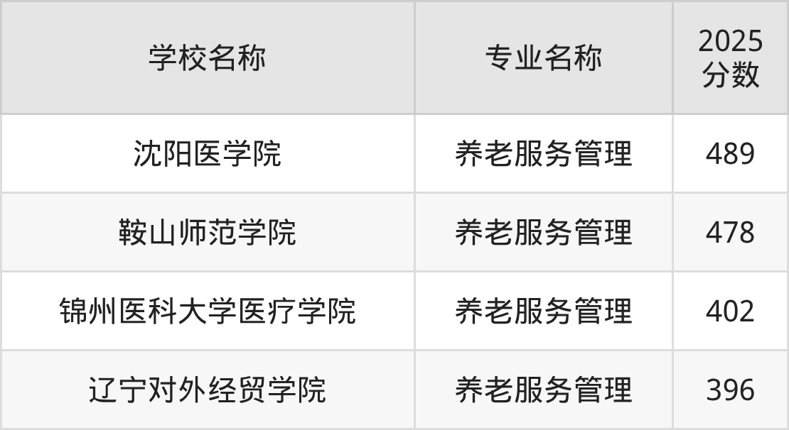 在直接以“养老服务管理”的名称招生的辽宁省大学中,沈阳医学院的分数线最高、排名第一名,在历史组的最低分是505分,全省排名前13997位的高考生才有较大机会被录取。