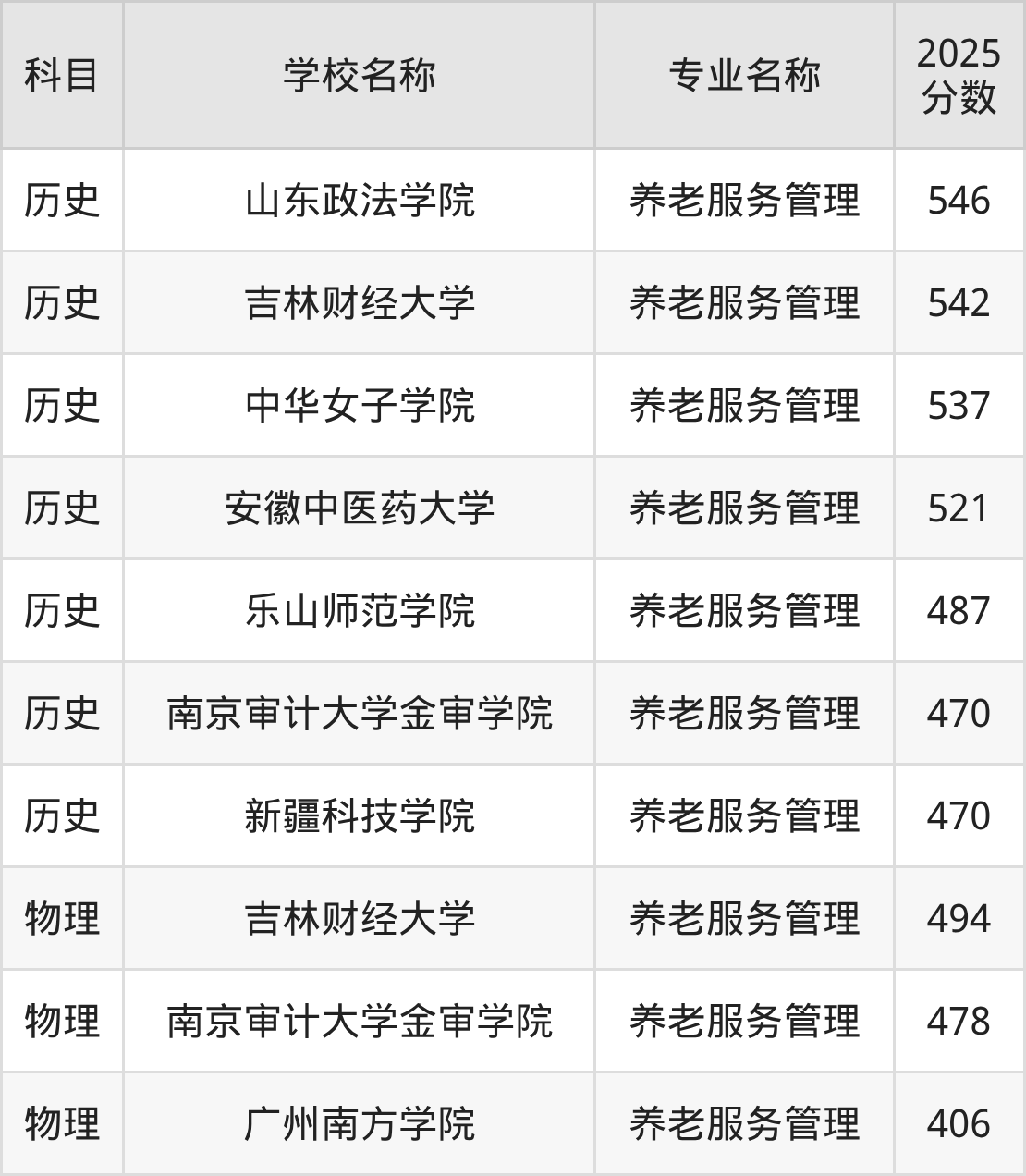通过上文大家可以知晓,在辽宁省内招养老服务管理专业的院校数量较少,所以下文将为2026届高考生继续展示:省外大学的养老服务管理专业2025年在辽宁高考的录取情况,包含山东政法学院、吉林财经大学、中华女子学院、安徽中医药大学、乐山师范学院。