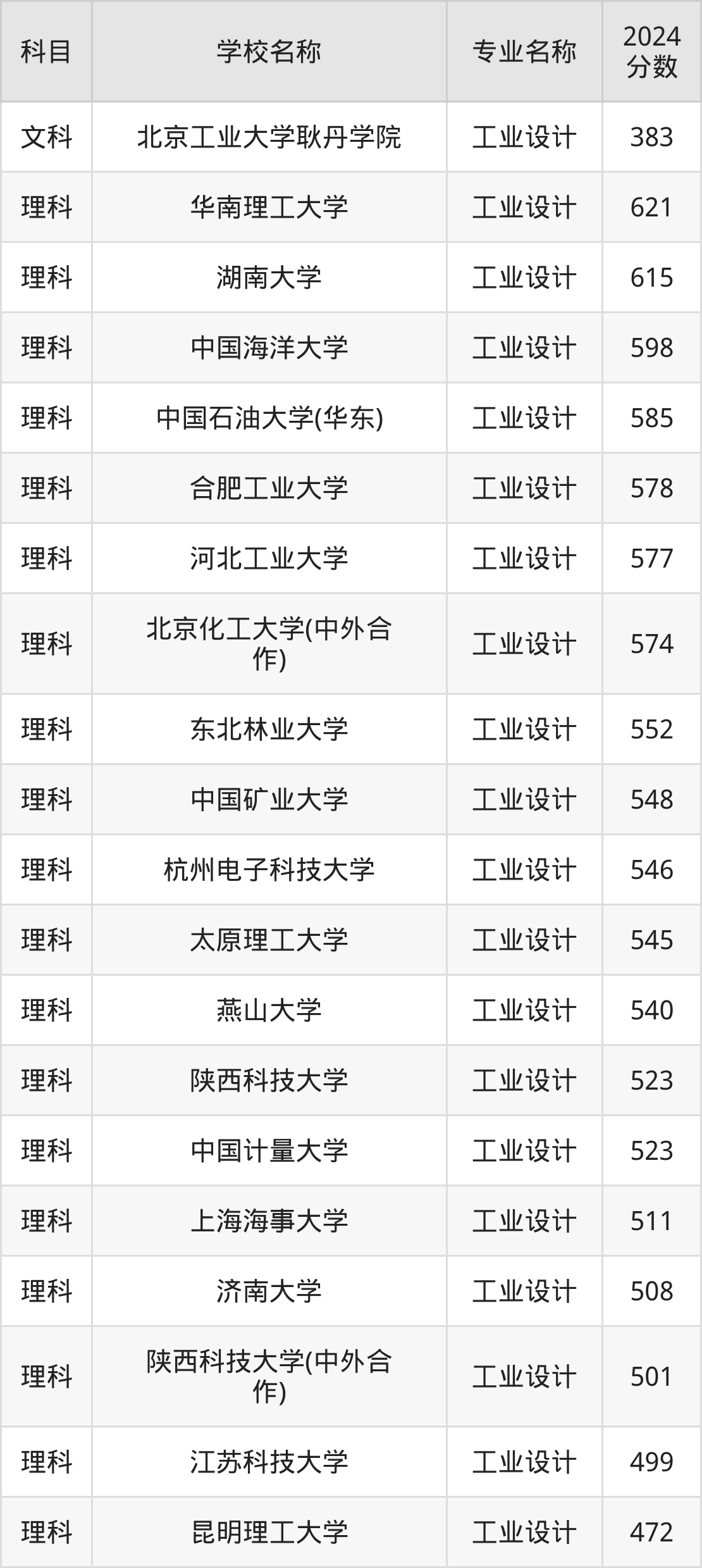 通过上文大家可以知晓,在内蒙古自治区内招工业设计专业的院校数量较少,所以下文将为2025届高考生继续展示:自治区外大学的工业设计专业2024年在内蒙古高考的录取情况,包含北京工业大学耿丹学院、华南理工大学、湖南大学、中国海洋大学、中国石油大学(华东)。