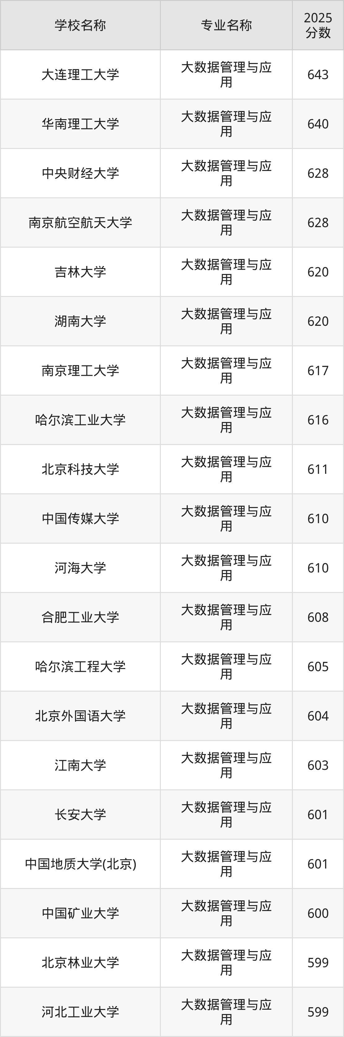 通过上文大家可以知晓,在山东省内招大数据管理与应用专业的院校数量较少,所以下文将为2026届高考生继续展示:省外大学的大数据管理与应用专业2025年在山东高考的录取情况,包含大连理工大学、华南理工大学、中央财经大学、南京航空航天大学、吉林大学。