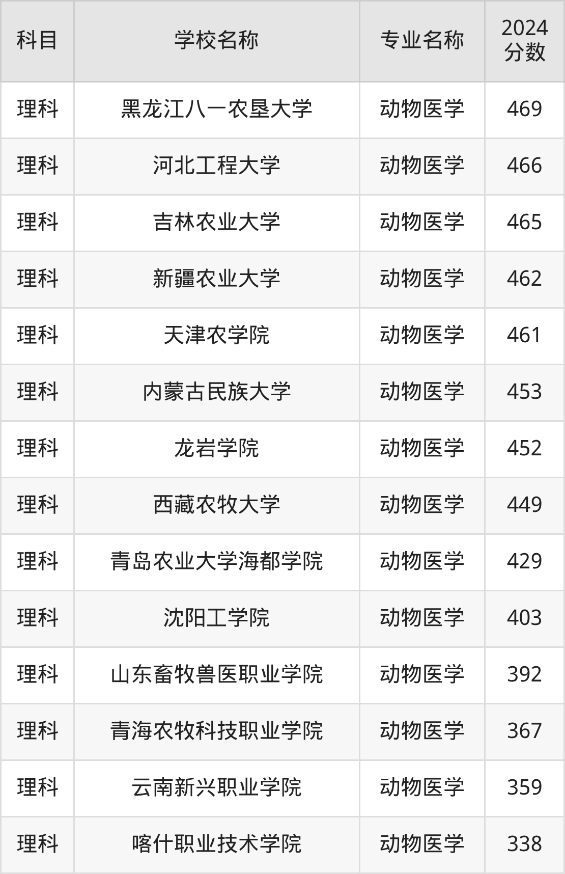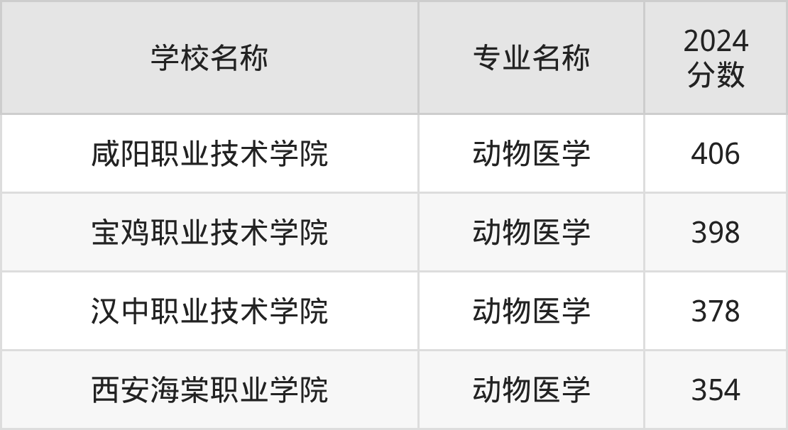 | 汉中职业技术学院 | 动物医学 | 370 |