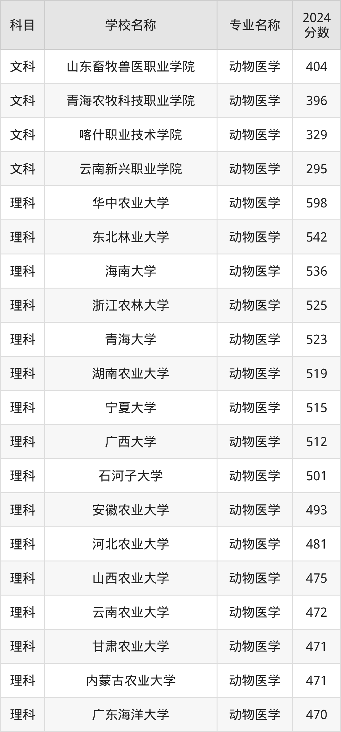 通过上文大家可以知晓,在陕西省内招动物医学专业的院校数量较少,所以下文将为2026届高考生继续展示:省外大学的动物医学专业2024年在陕西高考的录取情况,包含山东畜牧兽医职业学院、青海农牧科技职业学院、喀什职业技术学院、云南新兴职业学院、华中农业大学。