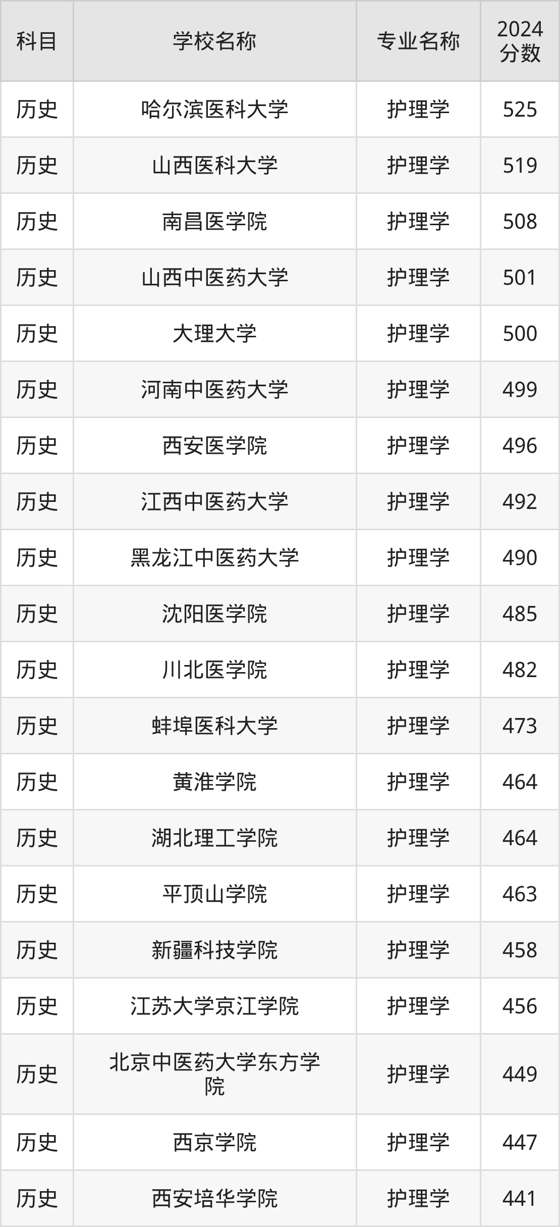 通过上文大家可以知晓,在甘肃省内招护理学专业的院校数量较少,所以下文将为2026届高考生继续展示:省外大学的护理学专业2024年在甘肃高考的录取情况,包含哈尔滨医科大学、山西医科大学、南昌医学院、山西中医药大学、大理大学。