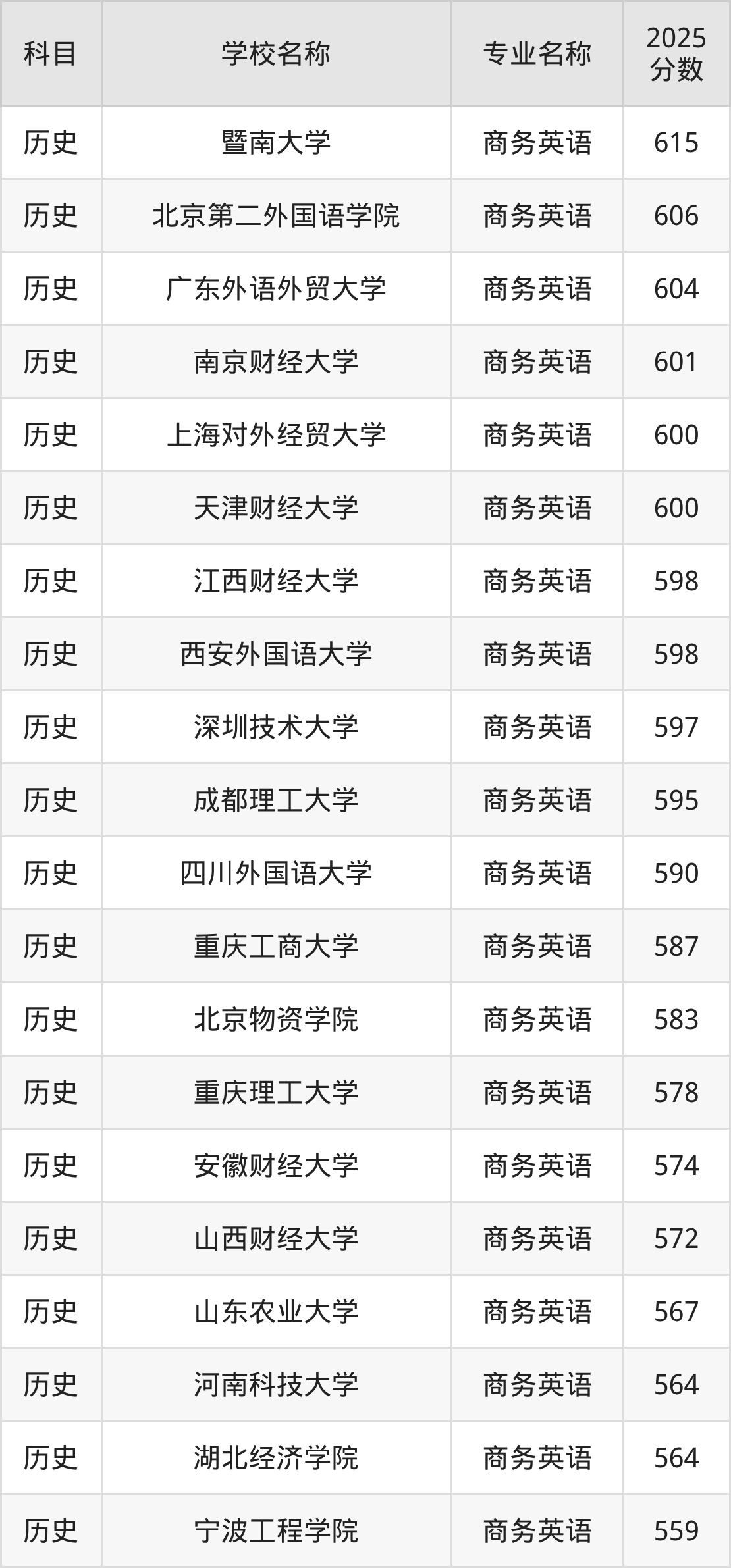通过上文大家可以知晓,在河北省内招商务英语专业的院校数量较少,所以下文将为2026届高考生继续展示:省外大学的商务英语专业2025年在河北高考的录取情况,包含暨南大学、北京第二外国语学院、广东外语外贸大学、南京财经大学、上海对外经贸大学。