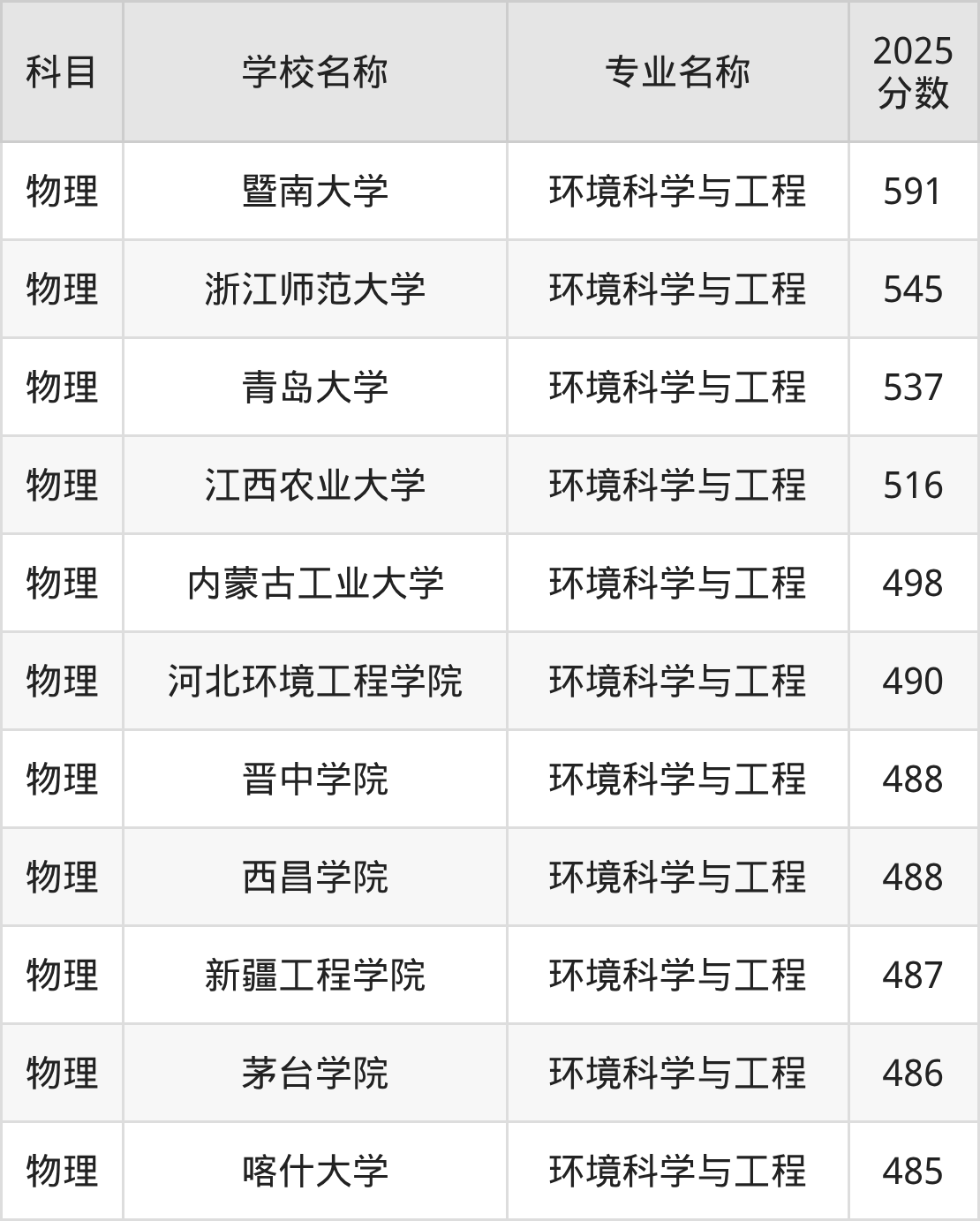 通过上文大家可以知晓,在重庆市内招环境科学与工程专业的院校数量较少,所以下文将为2026届高考生继续展示:市外大学的环境科学与工程专业2025年在重庆高考的录取情况,包含暨南大学、浙江师范大学、青岛大学、江西农业大学、内蒙古工业大学。