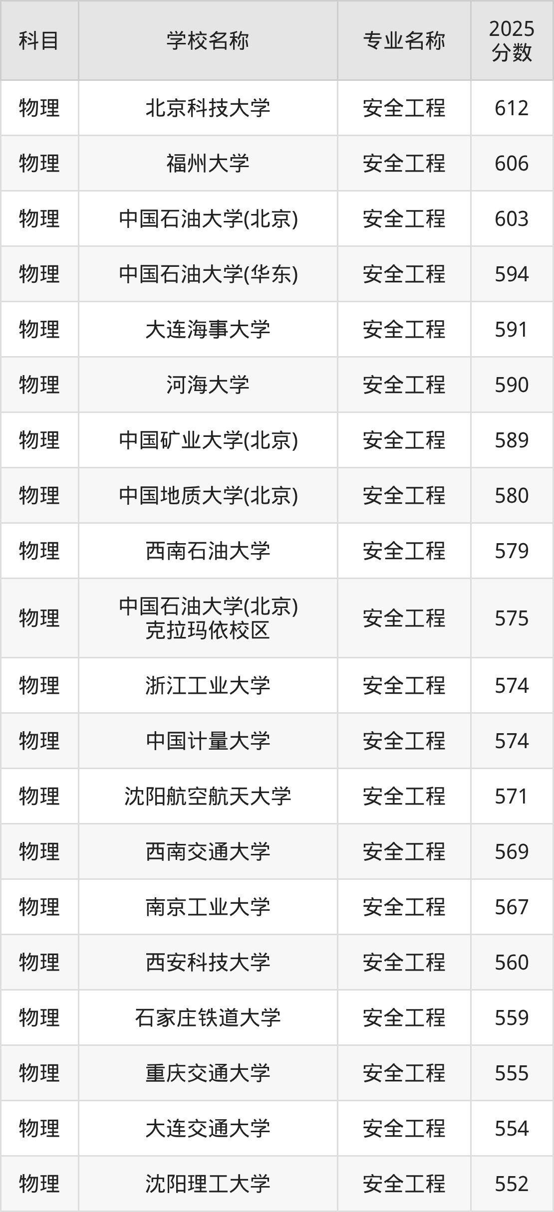 通过上文大家可以知晓,在山西省内招安全工程专业的院校数量较少,所以下文将为2026届高考生继续展示:省外大学的安全工程专业2025年在山西高考的录取情况,包含北京科技大学、福州大学、中国石油大学(北京)、中国石油大学(华东)、大连海事大学。
