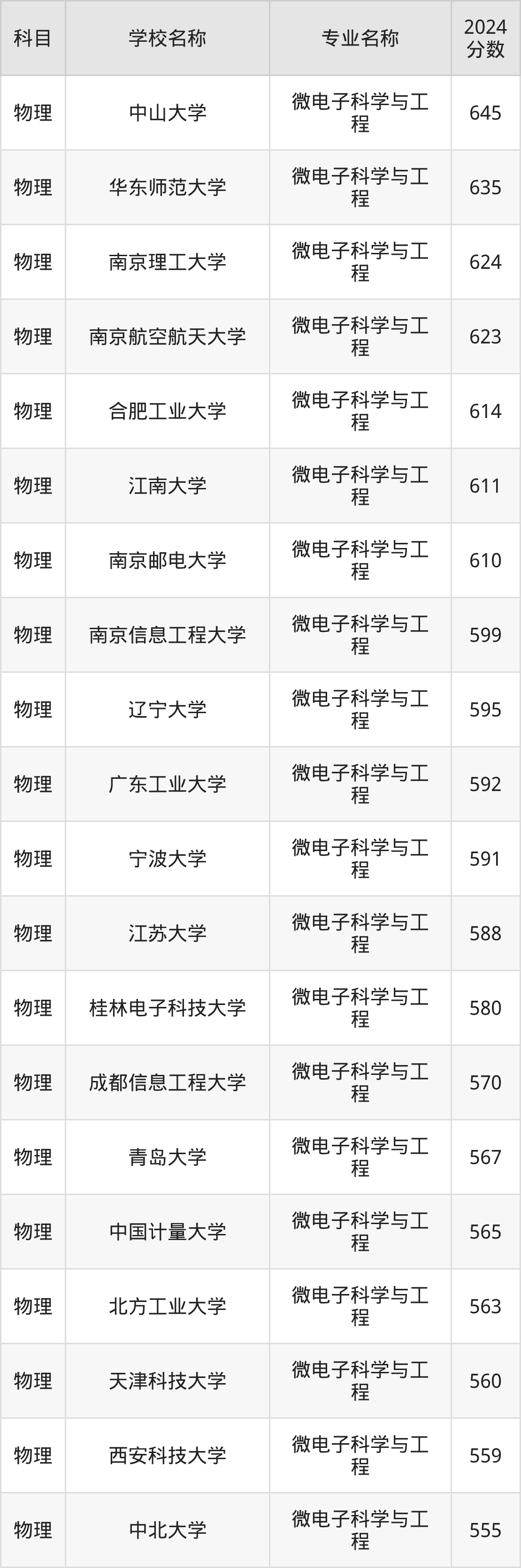 | 湖南大学 | 微电子科学与工 程(应用于5G 通讯、新能源汽 车、人工智能国 家战略性高新技 术领域) | 628 |