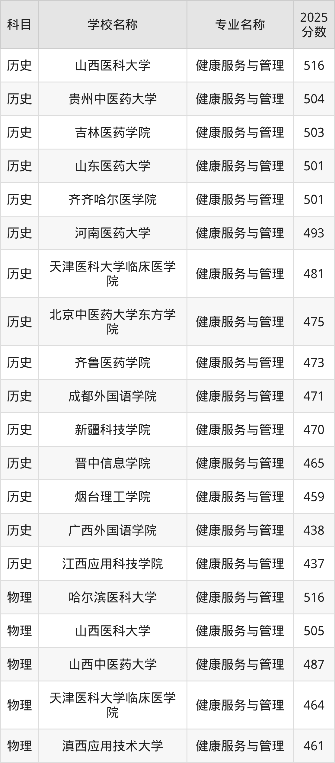 通过上文大家可以知晓,在辽宁省内招健康服务与管理专业的院校数量较少,所以下文将为2026届高考生继续展示:省外大学的健康服务与管理专业2025年在辽宁高考的录取情况,包含山西医科大学、贵州中医药大学、吉林医药学院、山东医药大学、齐齐哈尔医学院。