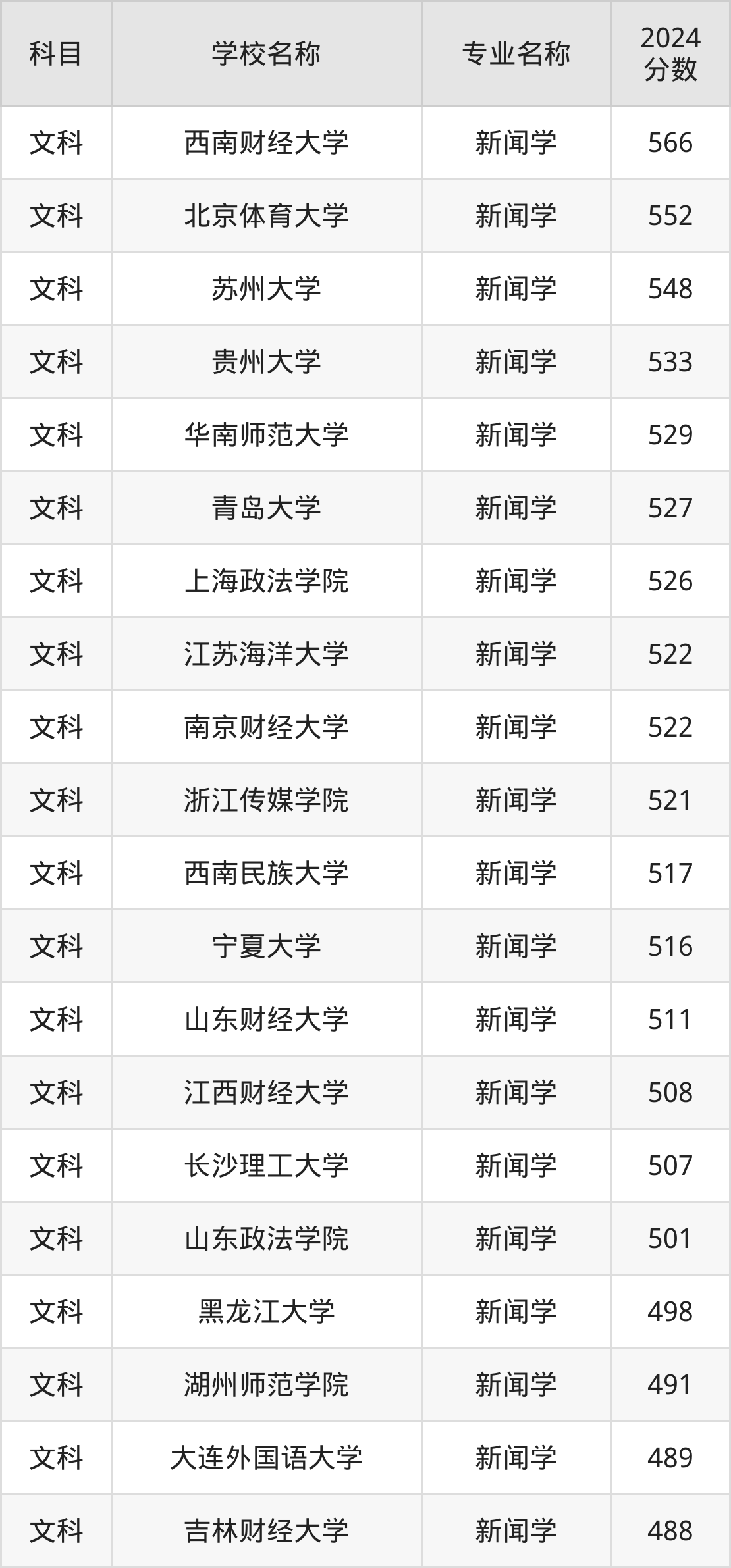 通过上文大家可以知晓,在内蒙古自治区内招新闻学专业的院校数量较少,所以下文将为2025届高考生继续展示:自治区外大学的新闻学专业2024年在内蒙古高考的录取情况,包含西南财经大学、北京体育大学、苏州大学、贵州大学、华南师范大学。