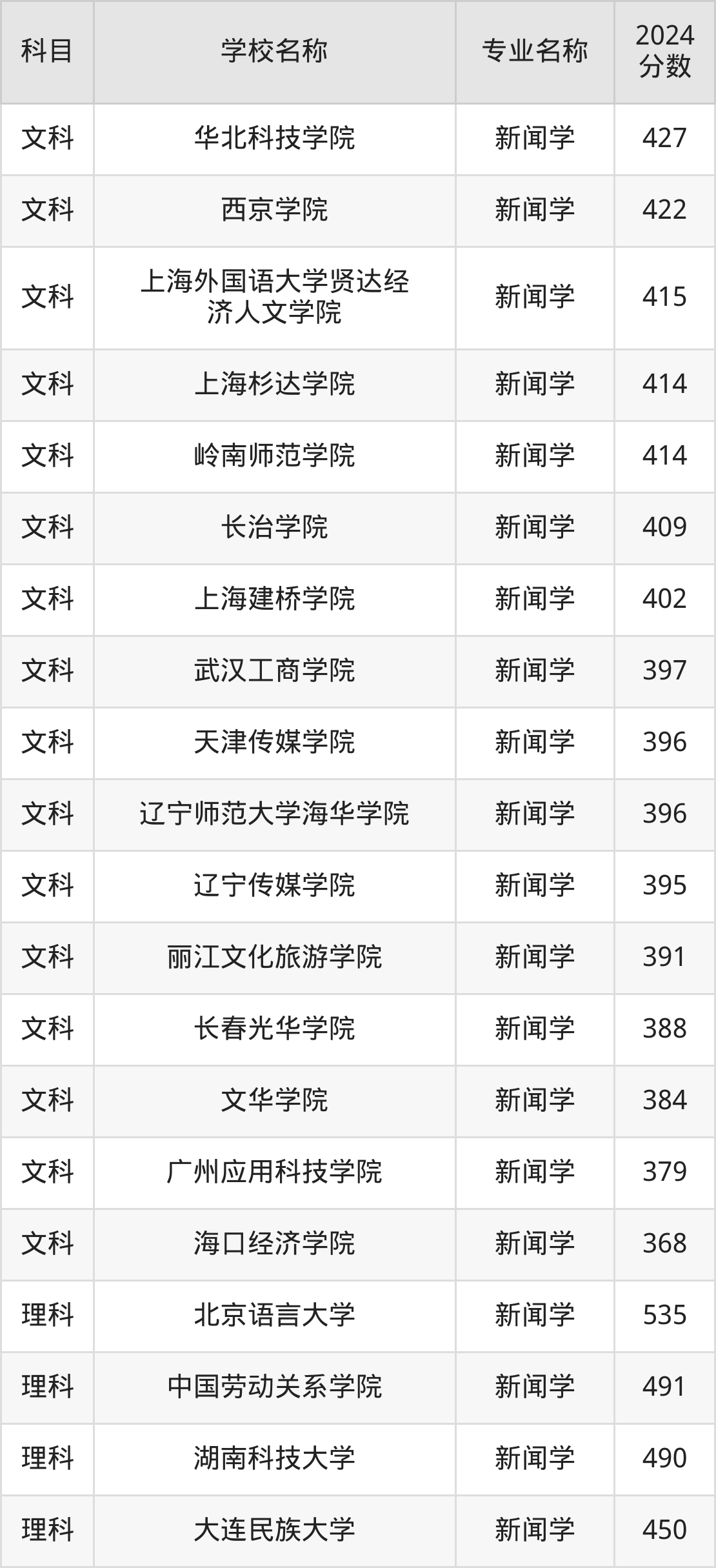 | 内蒙古鸿德文理学院 | 新闻学(办学地 点:校本部) | 396 |