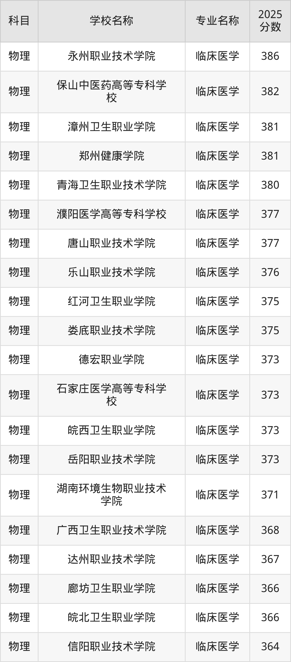 | 安顺职业技术学院 | 临床医学 | 369 |