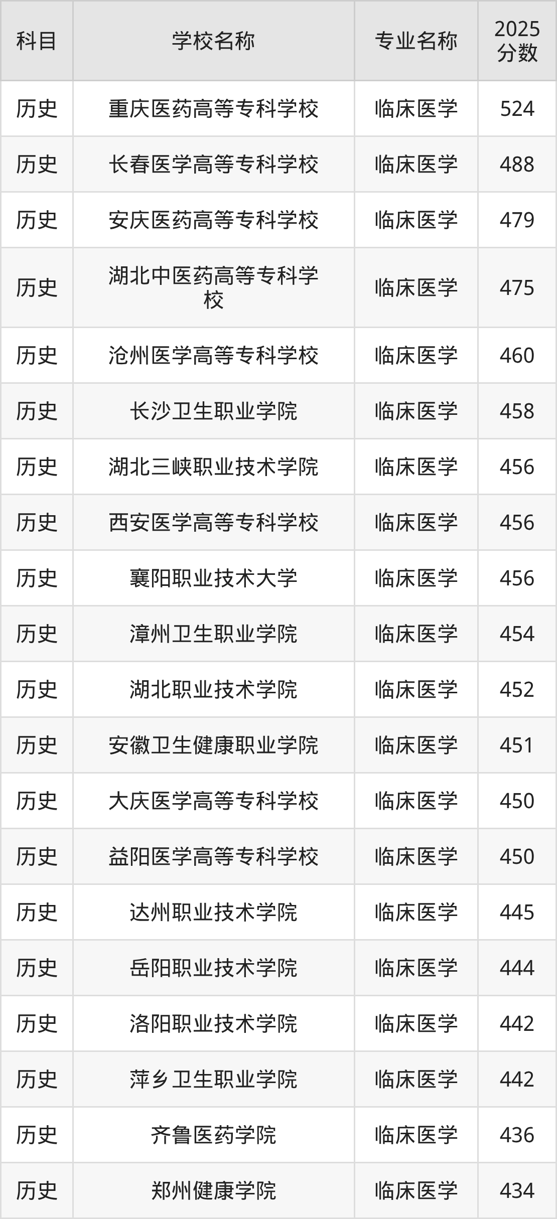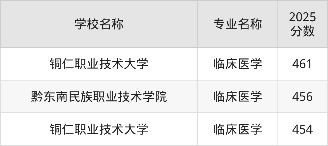 通过上文大家可以知晓,在贵州省内招临床医学专业的院校数量较少,所以下文将为2026届高考生继续展示:省外大学的临床医学专业2025年在贵州高考的录取情况,包含重庆医药高等专科学校、长春医学高等专科学校、安庆医药高等专科学校、湖北中医药高等专科学校、沧州医学高等专科学校。