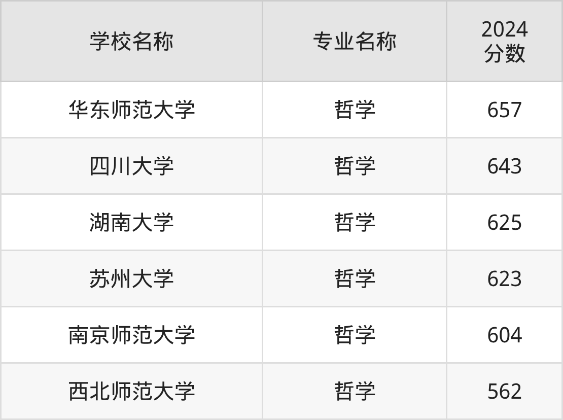 通过上文大家可以知晓,在北京市内招哲学专业的院校数量较少,所以下文将为2026届高考生继续展示:市外大学的哲学专业2024年在北京高考的录取情况,包含华东师范大学、四川大学、湖南大学、苏州大学、南京师范大学。