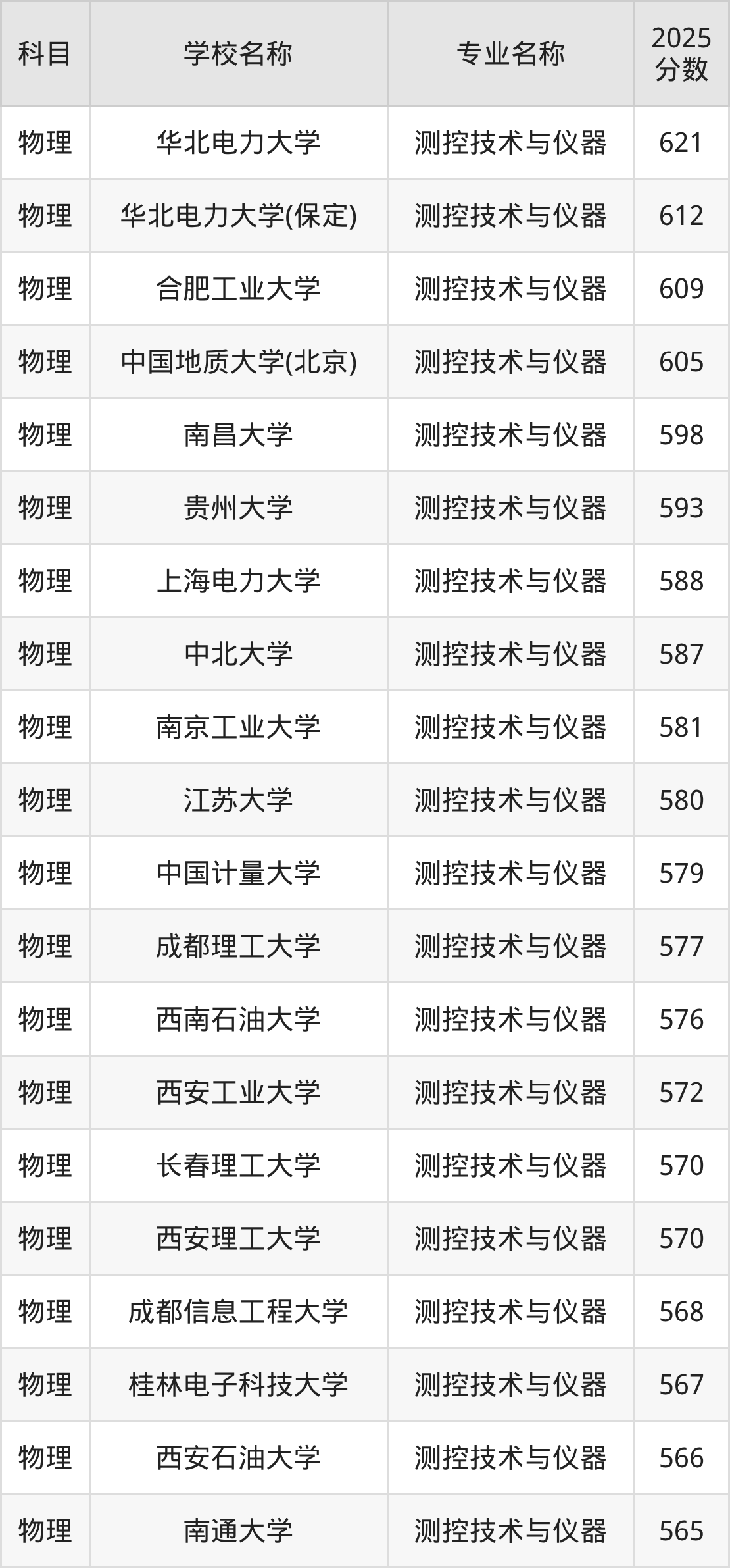 通过上文大家可以知晓,在重庆市内招测控技术与仪器专业的院校数量较少,所以下文将为2026届高考生继续展示:市外大学的测控技术与仪器专业2025年在重庆高考的录取情况,包含华北电力大学、华北电力大学(保定)、合肥工业大学、中国地质大学(北京)、南昌大学。