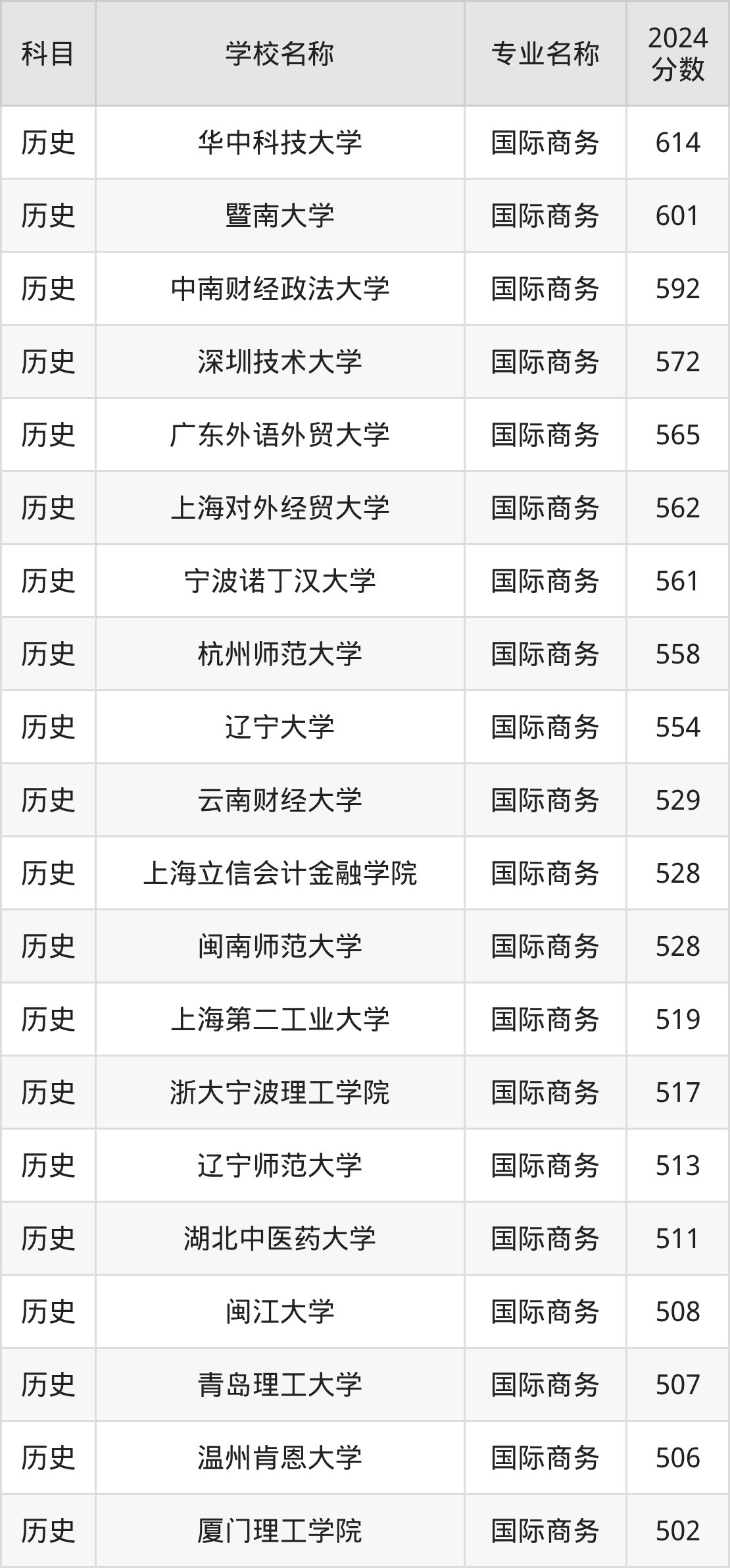 通过上文大家可以知晓,在广西壮族自治区内招国际商务专业的院校数量较少,所以下文将为2026届高考生继续展示:壮族自治区外大学的国际商务专业2024年在广西高考的录取情况,包含华中科技大学、暨南大学、中南财经政法大学、深圳技术大学、广东外语外贸大学。