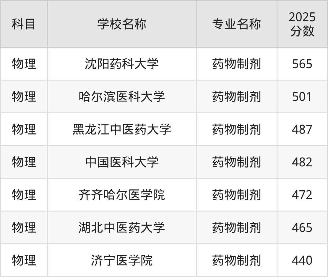 通过上文大家可以知晓,在吉林省内招药物制剂专业的院校数量较少,所以下文将为2026届高考生继续展示:省外大学的药物制剂专业2025年在吉林高考的录取情况,包含沈阳药科大学、哈尔滨医科大学、黑龙江中医药大学、中国医科大学、齐齐哈尔医学院。