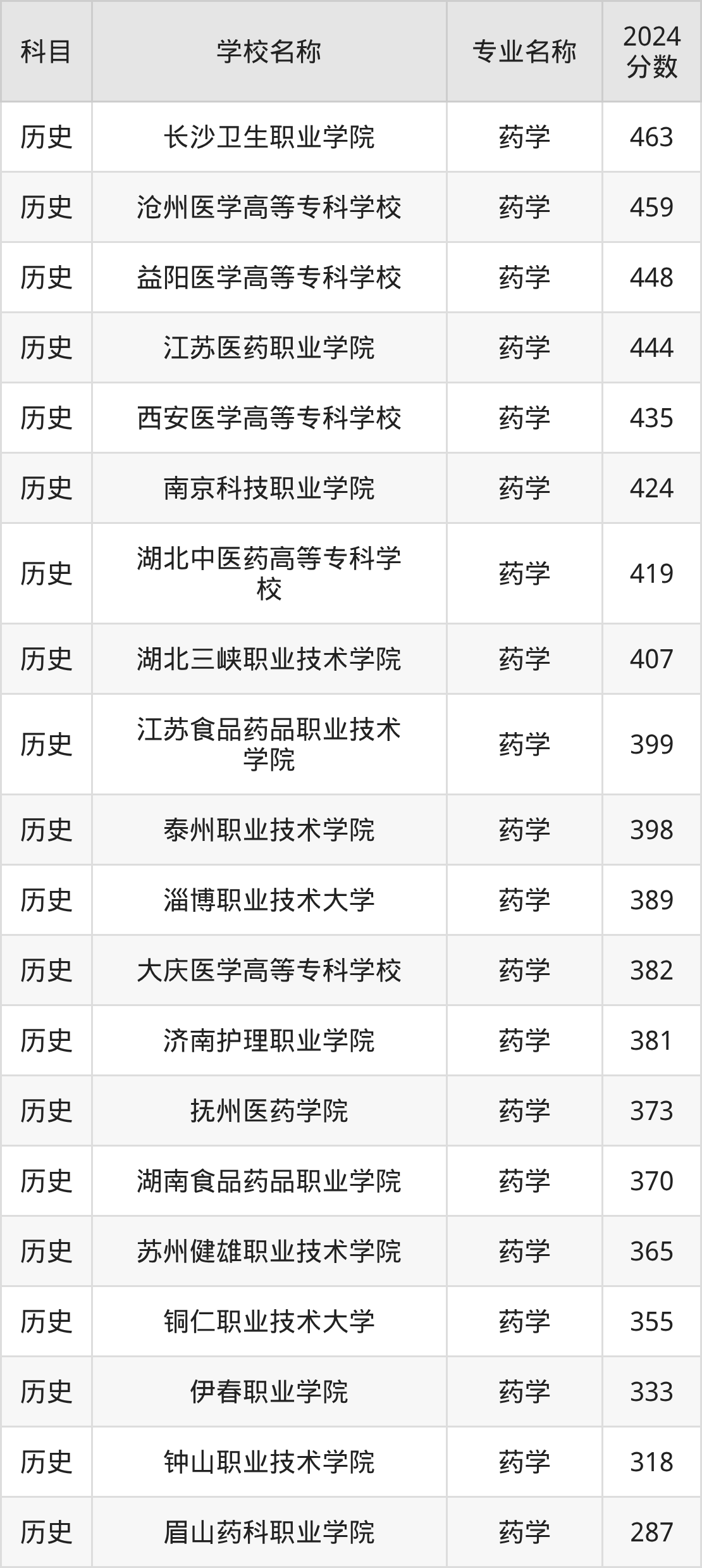 通过上文大家可以知晓,在安徽省内招药学专业的院校数量较少,所以下文将为2026届高考生继续展示:省外大学的药学专业2024年在安徽高考的录取情况,包含长沙卫生职业学院、沧州医学高等专科学校、益阳医学高等专科学校、江苏医药职业学院、西安医学高等专科学校。