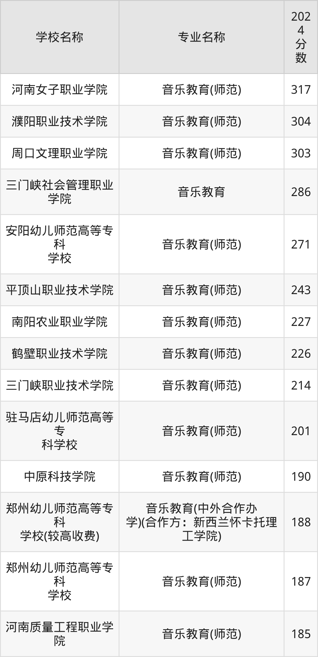 | 三门峡社会管理职业学 院 | 音乐教育 | 280 |