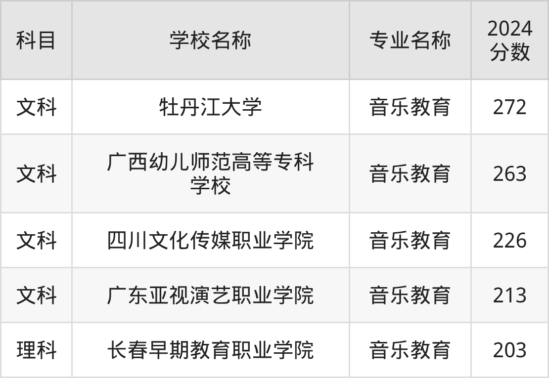 通过上文大家可以知晓,在河南省内招音乐教育专业的院校数量较少,所以下文将为2026届高考生继续展示:省外大学的音乐教育专业2024年在河南高考的录取情况,包含牡丹江大学、广西幼儿师范高等专科学校、四川文化传媒职业学院、广东亚视演艺职业学院、长春早期教育职业学院。