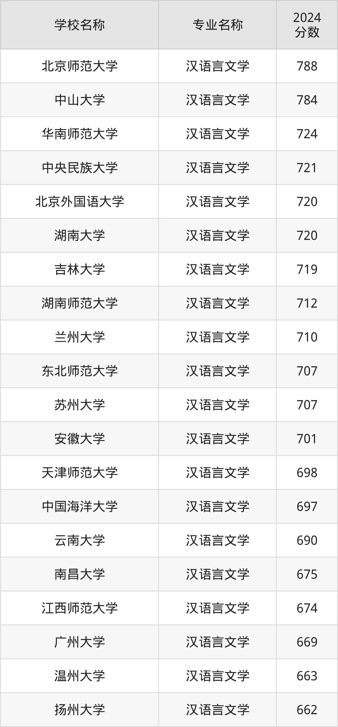 通过上文大家可以知晓,在海南省内招汉语言文学专业的院校数量较少,所以下文将为2026届高考生继续展示:省外大学的汉语言文学专业2024年在海南高考的录取情况,包含北京师范大学、中山大学、华南师范大学、中央民族大学、北京外国语大学。