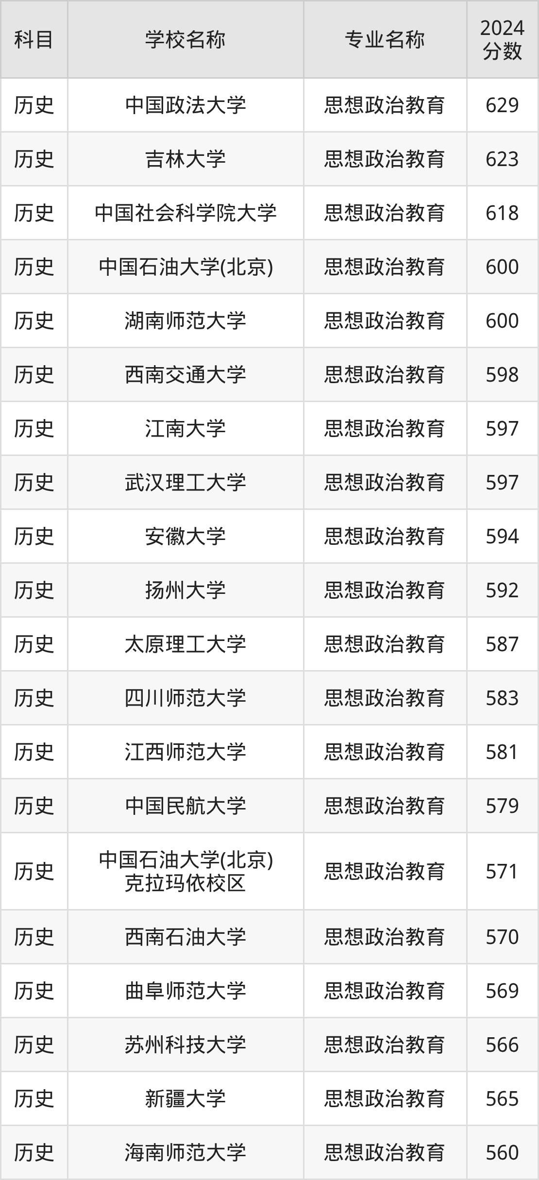 通过上文大家可以知晓,在黑龙江省内招思想政治教育专业的院校数量较少,所以下文将为2026届高考生继续展示:省外大学的思想政治教育专业2024年在黑龙江高考的录取情况,包含中国政法大学、吉林大学、中国社会科学院大学、中国石油大学(北京)、湖南师范大学。