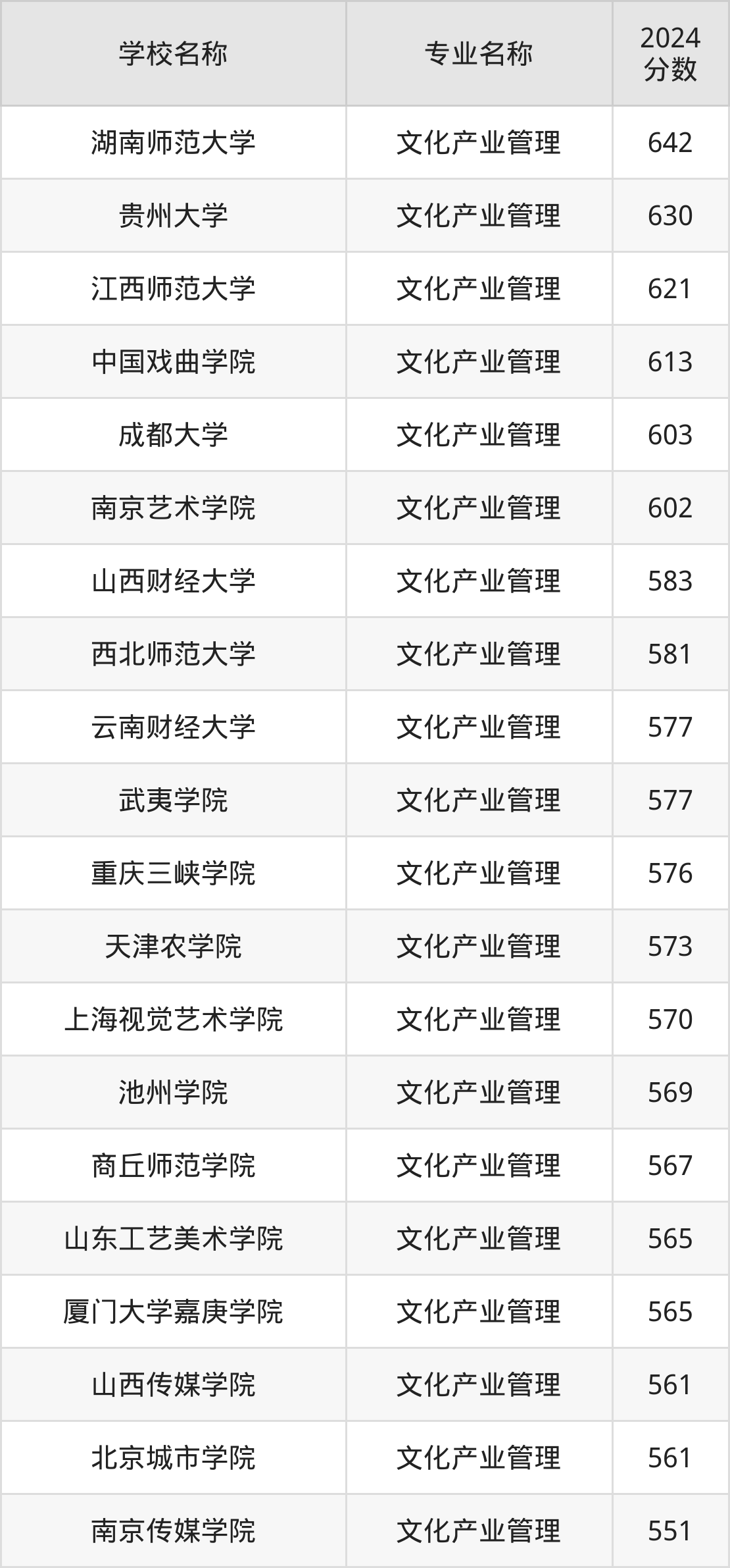 通过上文大家可以知晓,在浙江省内招文化产业管理专业的院校数量较少,所以下文将为2025届高考生继续展示:省外大学的文化产业管理专业2024年在浙江高考的录取情况,包含湖南师范大学、贵州大学、江西师范大学、中国戏曲学院、成都大学。