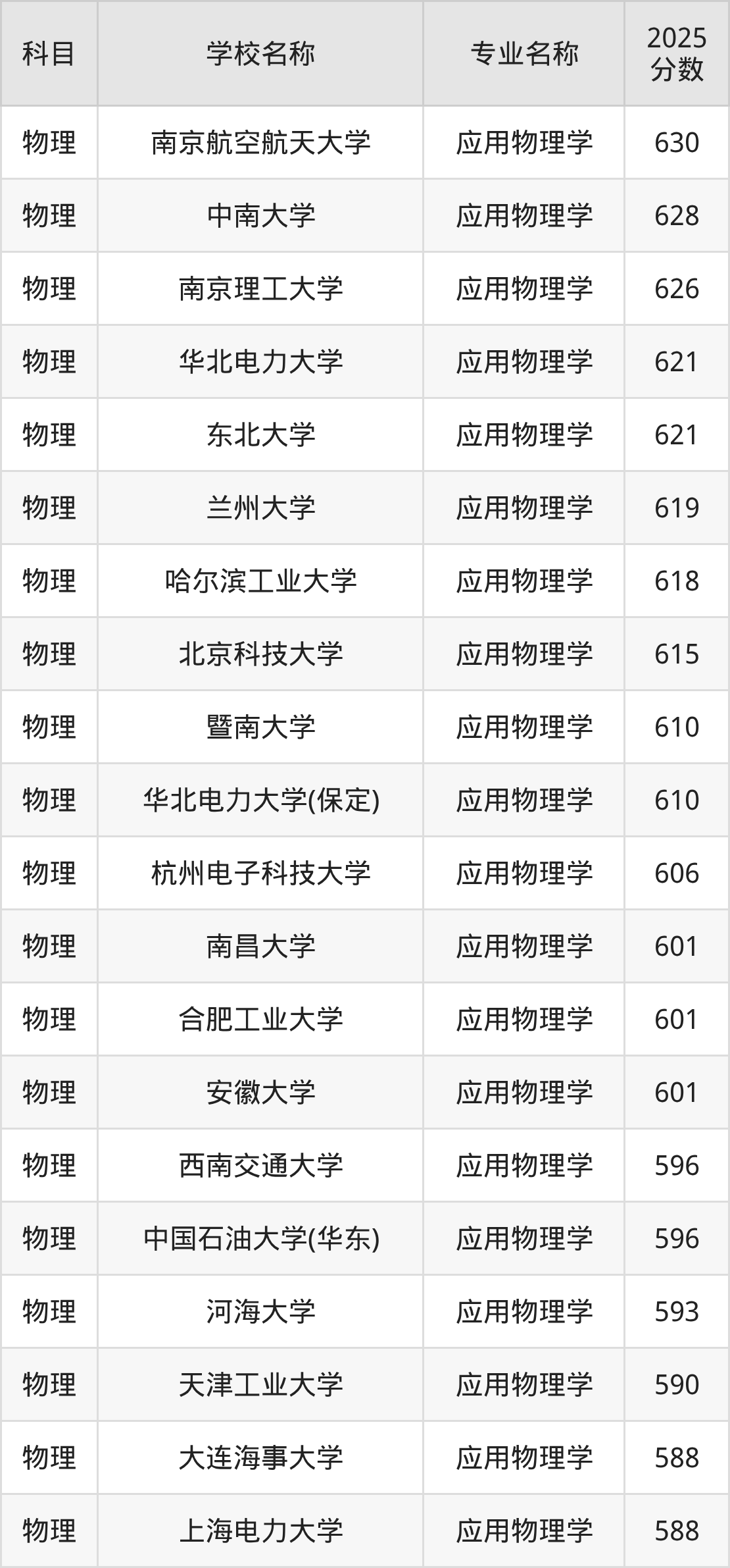 通过上文大家可以知晓,在山西省内招应用物理学专业的院校数量较少,所以下文将为2026届高考生继续展示:省外大学的应用物理学专业2025年在山西高考的录取情况,包含南京航空航天大学、中南大学、南京理工大学、华北电力大学、东北大学。