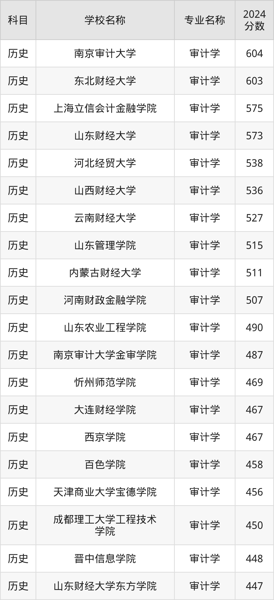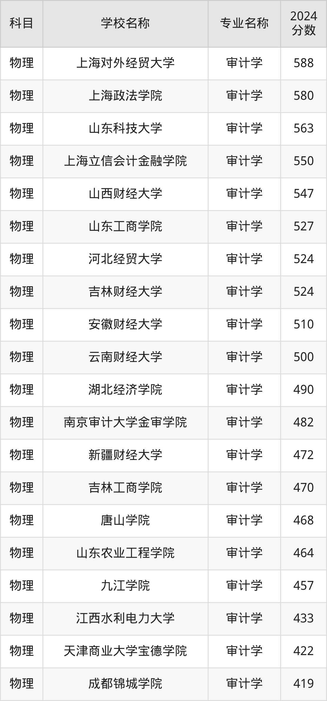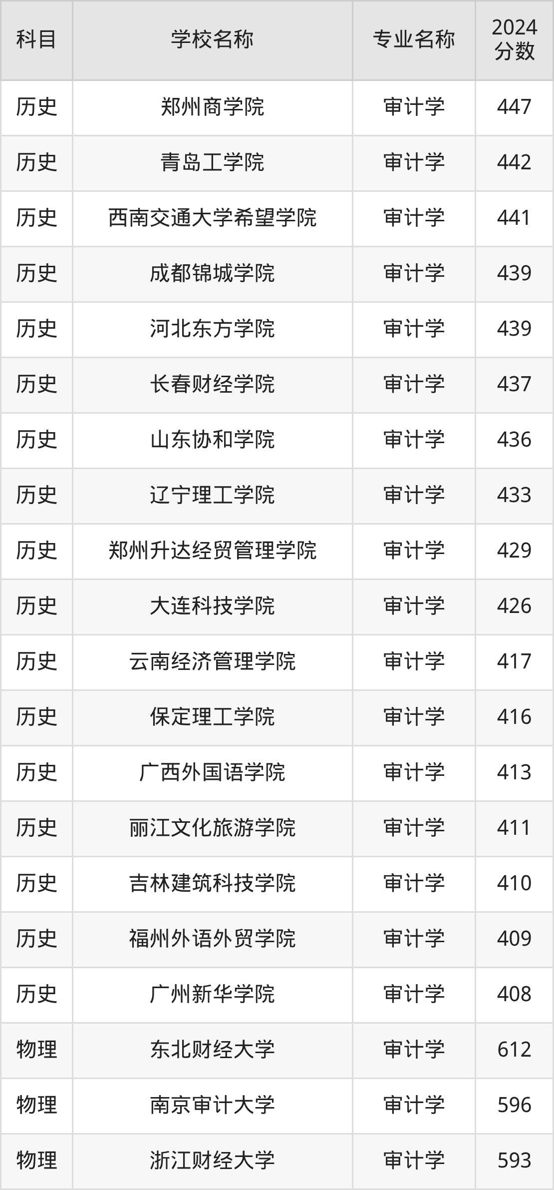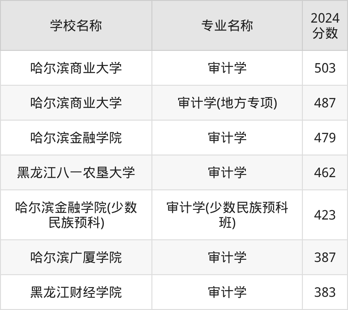 通过上文大家可以知晓,在黑龙江省内招审计学专业的院校数量较少,所以下文将为2026届高考生继续展示:省外大学的审计学专业2024年在黑龙江高考的录取情况,包含南京审计大学、东北财经大学、上海立信会计金融学院、山东财经大学、河北经贸大学。