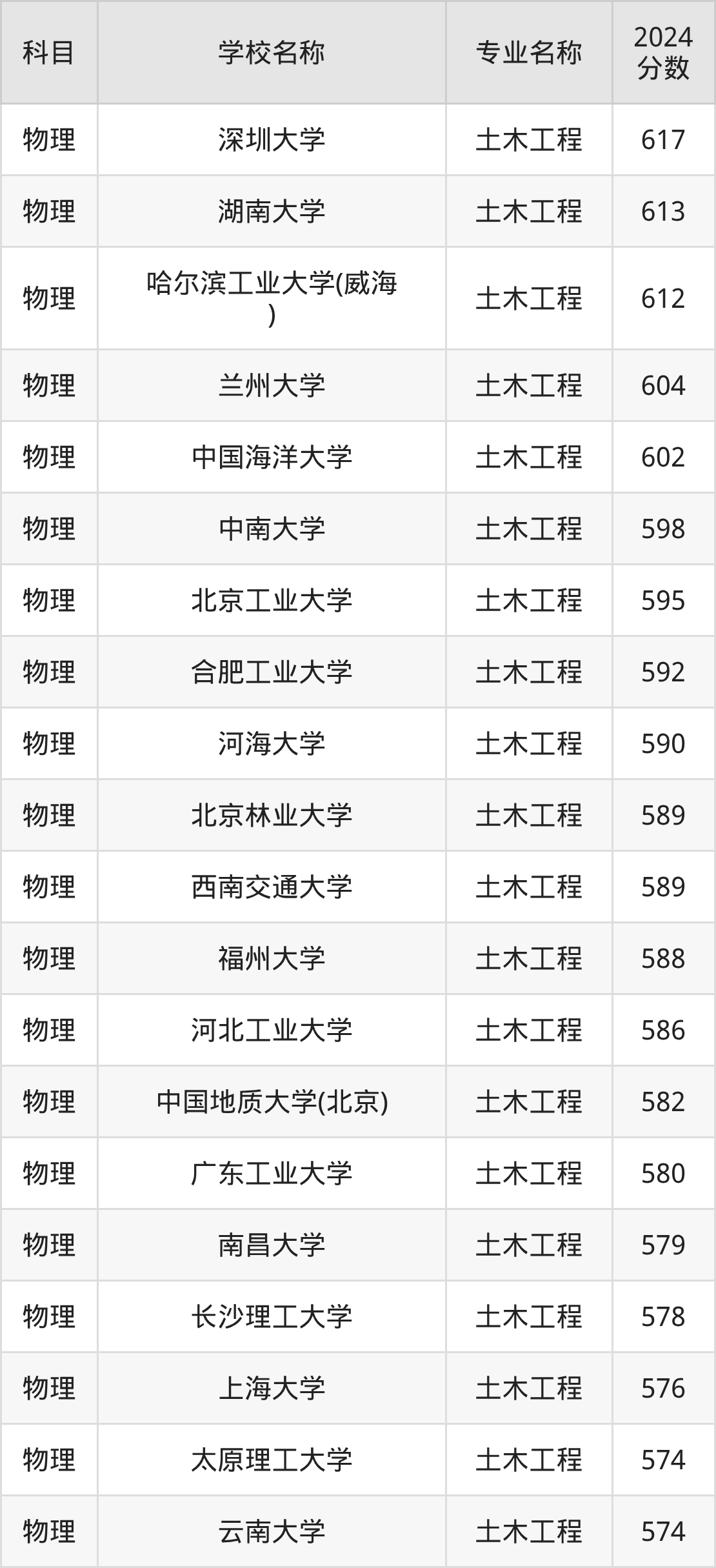 通过上文大家可以知晓,在广西壮族自治区内招土木工程专业的院校数量较少,所以下文将为2026届高考生继续展示:壮族自治区外大学的土木工程专业2024年在广西高考的录取情况,包含深圳大学、湖南大学、哈尔滨工业大学(威海)、兰州大学、中国海洋大学。