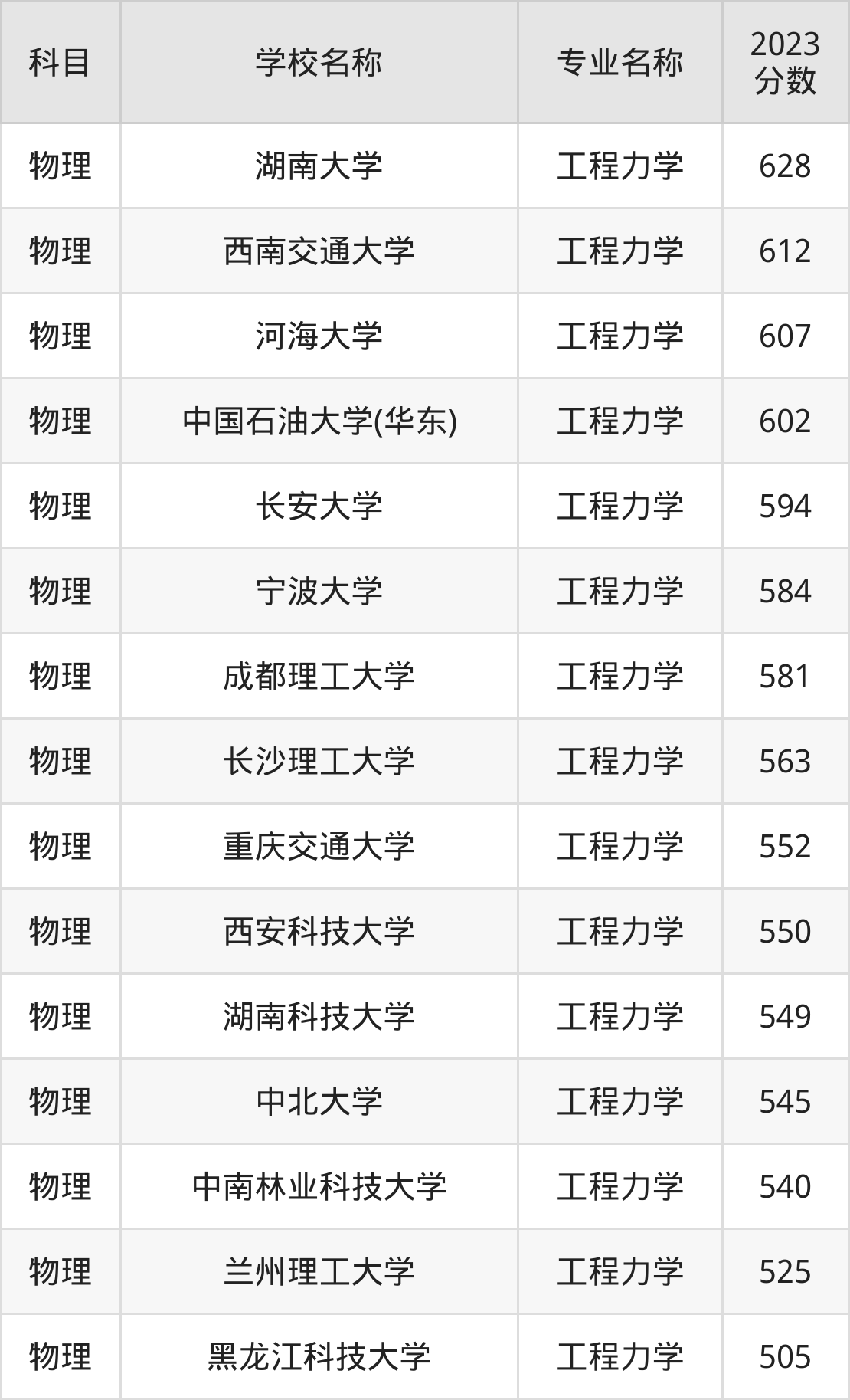 通过上文大家可以知晓,在广东省内招工程力学专业的院校数量较少,所以下文将为2025届高考生继续展示:省外大学的工程力学专业2023年在广东高考的录取情况,包含湖南大学、西南交通大学、河海大学、中国石油大学(华东)、长安大学。