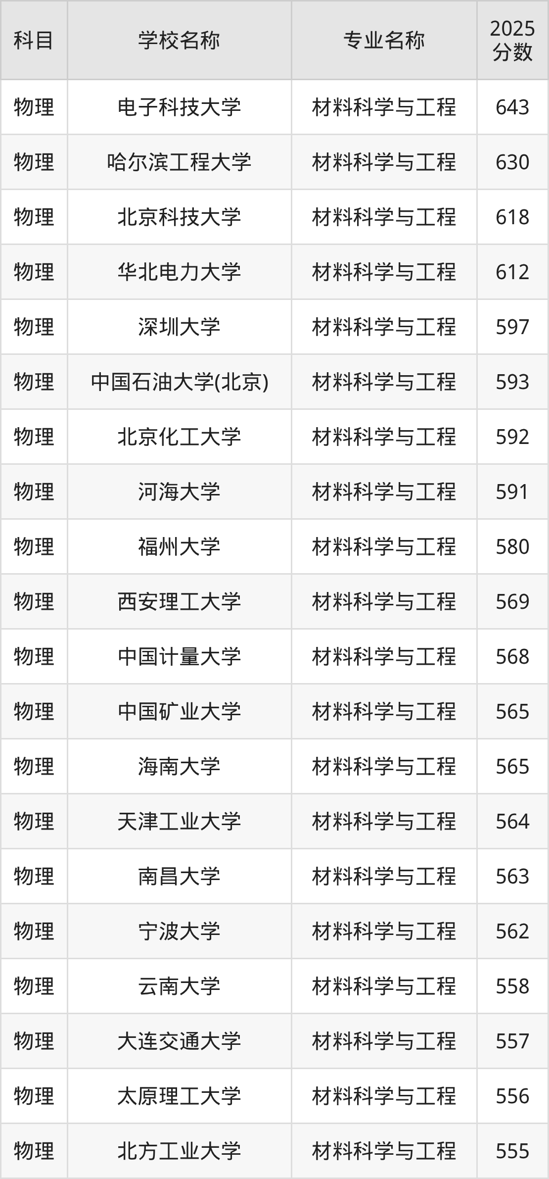 通过上文大家可以知晓,在吉林省内招材料科学与工程专业的院校数量较少,所以下文将为2026届高考生继续展示:省外大学的材料科学与工程专业2025年在吉林高考的录取情况,包含电子科技大学、哈尔滨工程大学、北京科技大学、华北电力大学、深圳大学。