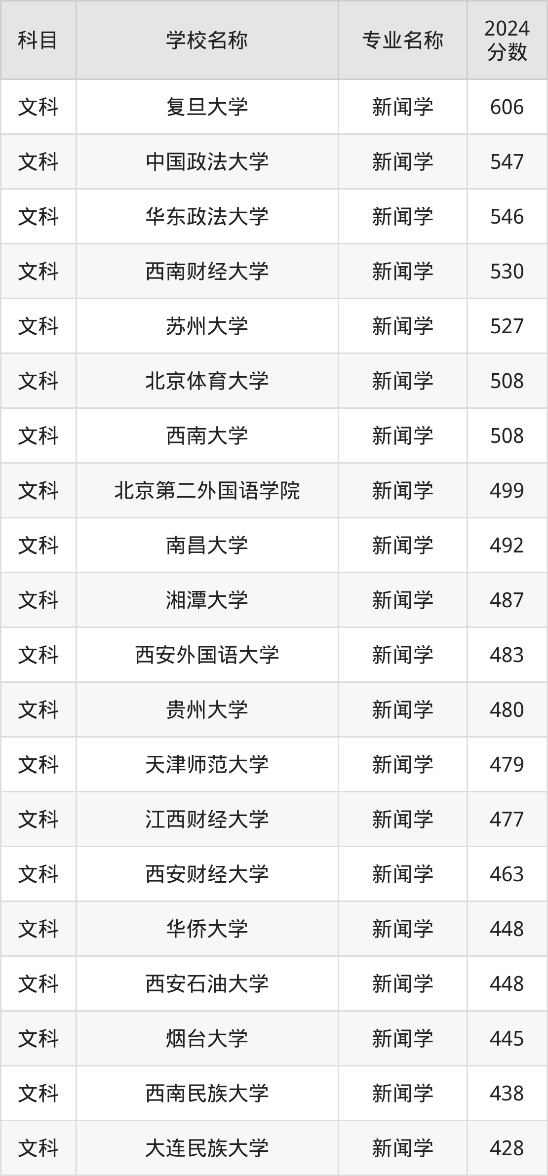 通过上文大家可以知晓,在新疆维吾尔自治区内招新闻学专业的院校数量较少,所以下文将为2025届高考生继续展示:维吾尔自治区外大学的新闻学专业2024年在新疆高考的录取情况,包含复旦大学、中国政法大学、华东政法大学、西南财经大学、苏州大学。