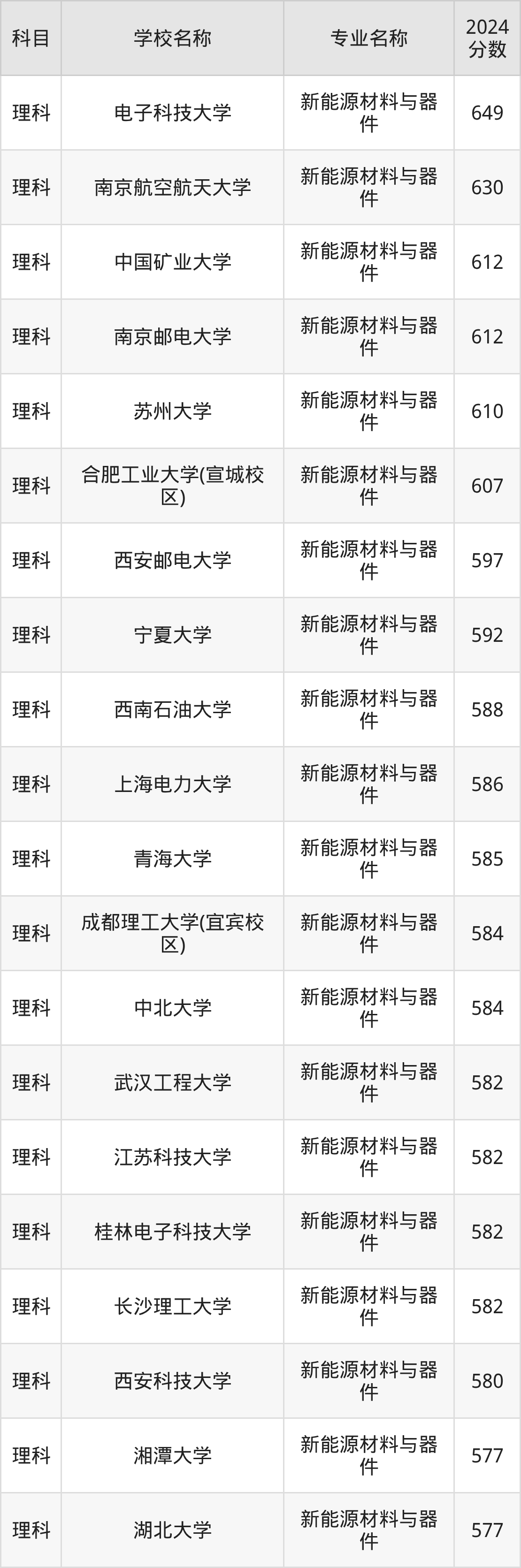 通过上文大家可以知晓,在河南省内招新能源材料与器件专业的院校数量较少,所以下文将为2026届高考生继续展示:省外大学的新能源材料与器件专业2024年在河南高考的录取情况,包含电子科技大学、南京航空航天大学、中国矿业大学、南京邮电大学、苏州大学。