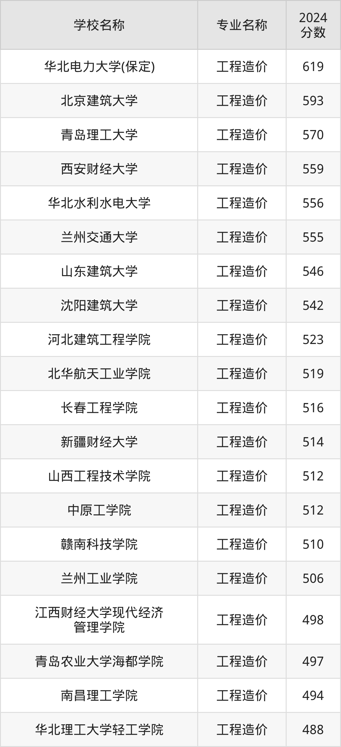 通过上文大家可以知晓,在天津市内招工程造价专业的院校数量较少,所以下文将为2026届高考生继续展示:市外大学的工程造价专业2024年在天津高考的录取情况,包含华北电力大学(保定)、北京建筑大学、青岛理工大学、西安财经大学、华北水利水电大学。