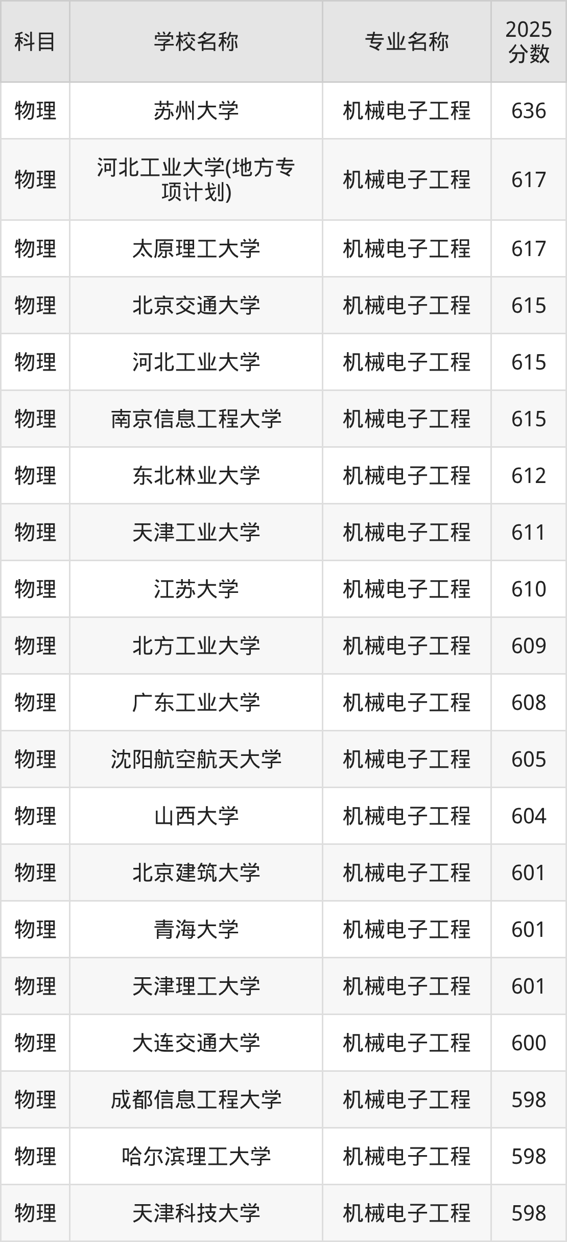 通过上文大家可以知晓,在河北省内招机械电子工程专业的院校数量较少,所以下文将为2026届高考生继续展示:省外大学的机械电子工程专业2025年在河北高考的录取情况,包含苏州大学、河北工业大学(地方专项计划)、太原理工大学、北京交通大学、河北工业大学。