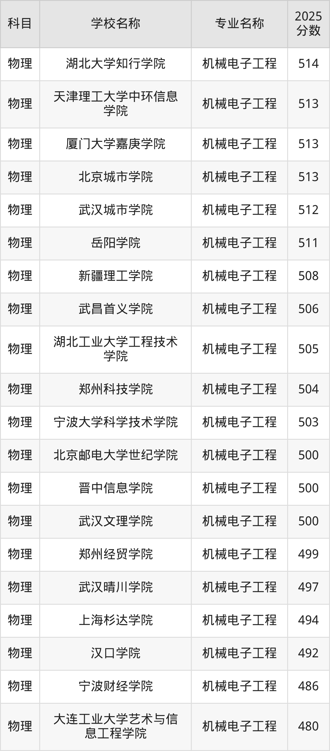 下文将为大家展示河北省大学机械电子工程专业2025年在河北高考的最低录取分数线!