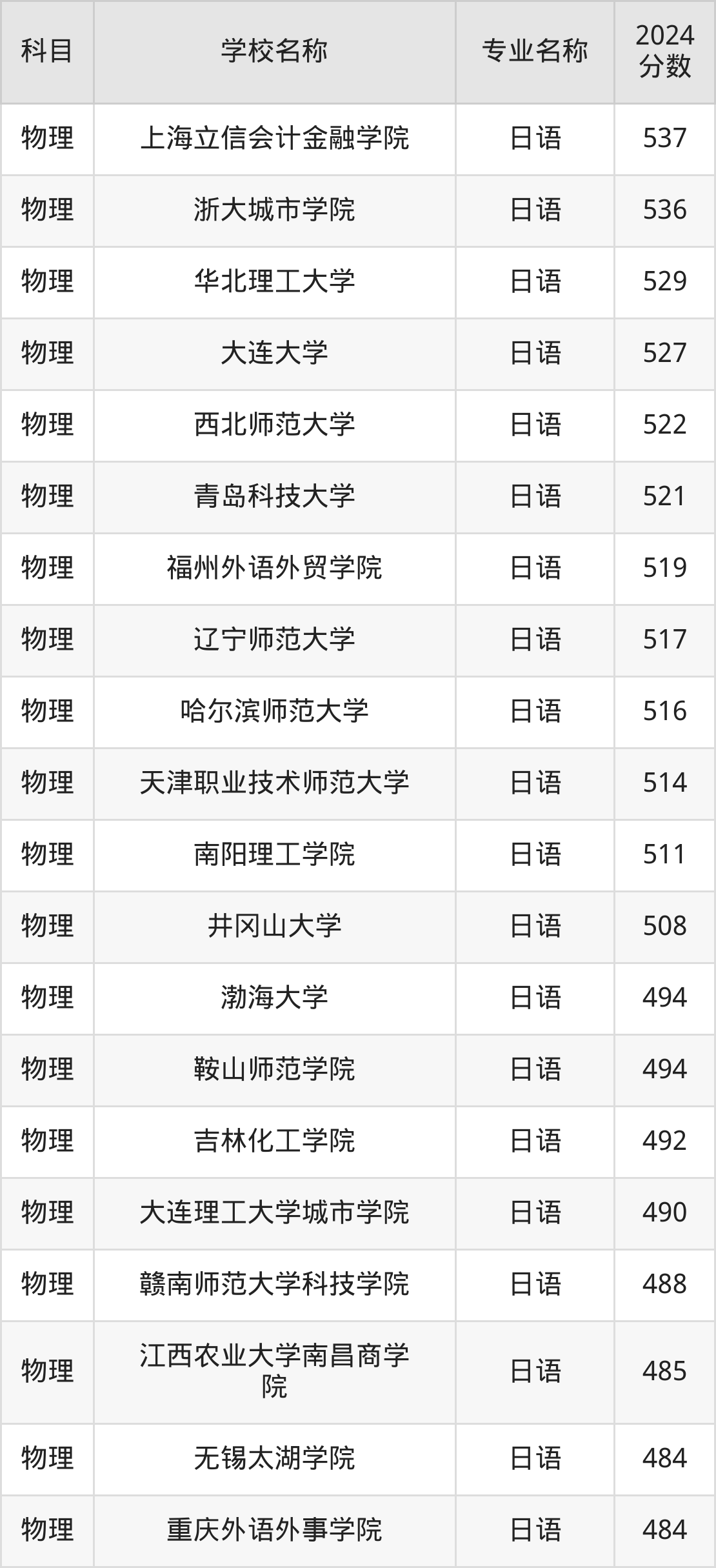 | 合肥大学 | 日语 | 535 |
